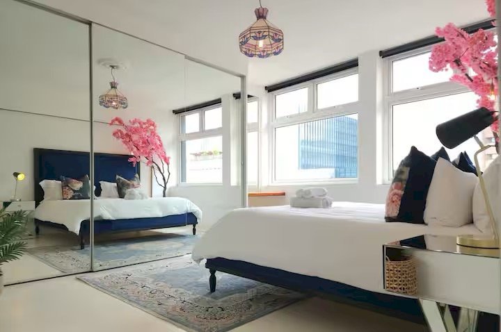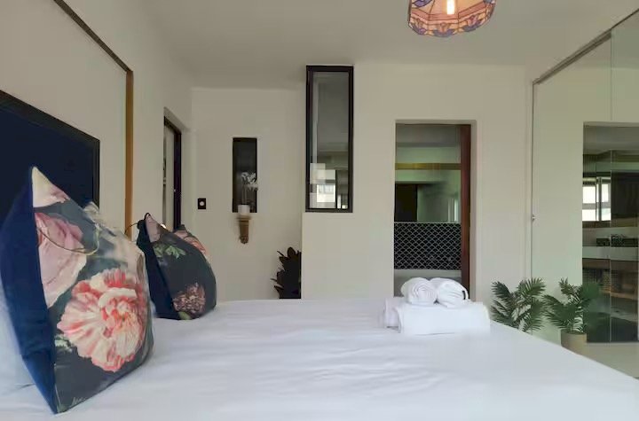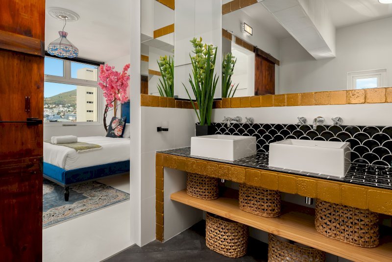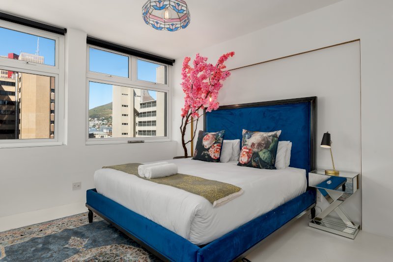 The main bedroom features a Queen-size bed and an ensuite bathroom with a gorgeous soaking tub, perfect for unwinding after a day of sightseeing. Enjoy stunning views of the city and a peek of Table Mountain from the comfort of your room.