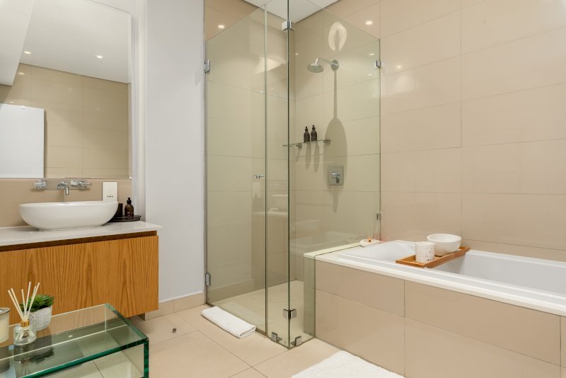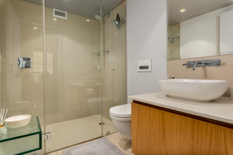 Each room is a haven of tranquility, with plush bedding and ample storage space. The lower bedroom features an ensuite bathroom with a luxurious bath and walk-in shower and the second bedroom also features an ensuite bathroom with a walk-in shower. Wake up to the gentle sea breeze and savour your morning coffee on the balcony as the city comes to life.