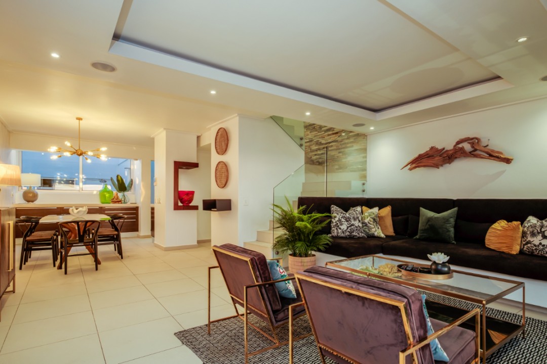 Upstairs, you will find 3 bedrooms all air conditioned. The master bedroom has a private balcony with sea views and seating. The en-suite bedroom is open plan (with an enclosed toilet). Bedrooms 2 & 3 are smaller, have mountain views and share a bathroom.