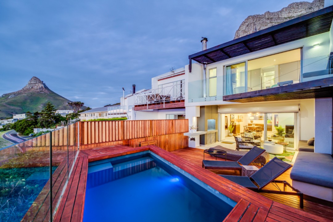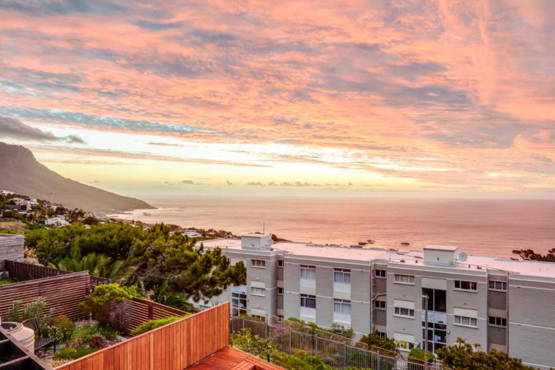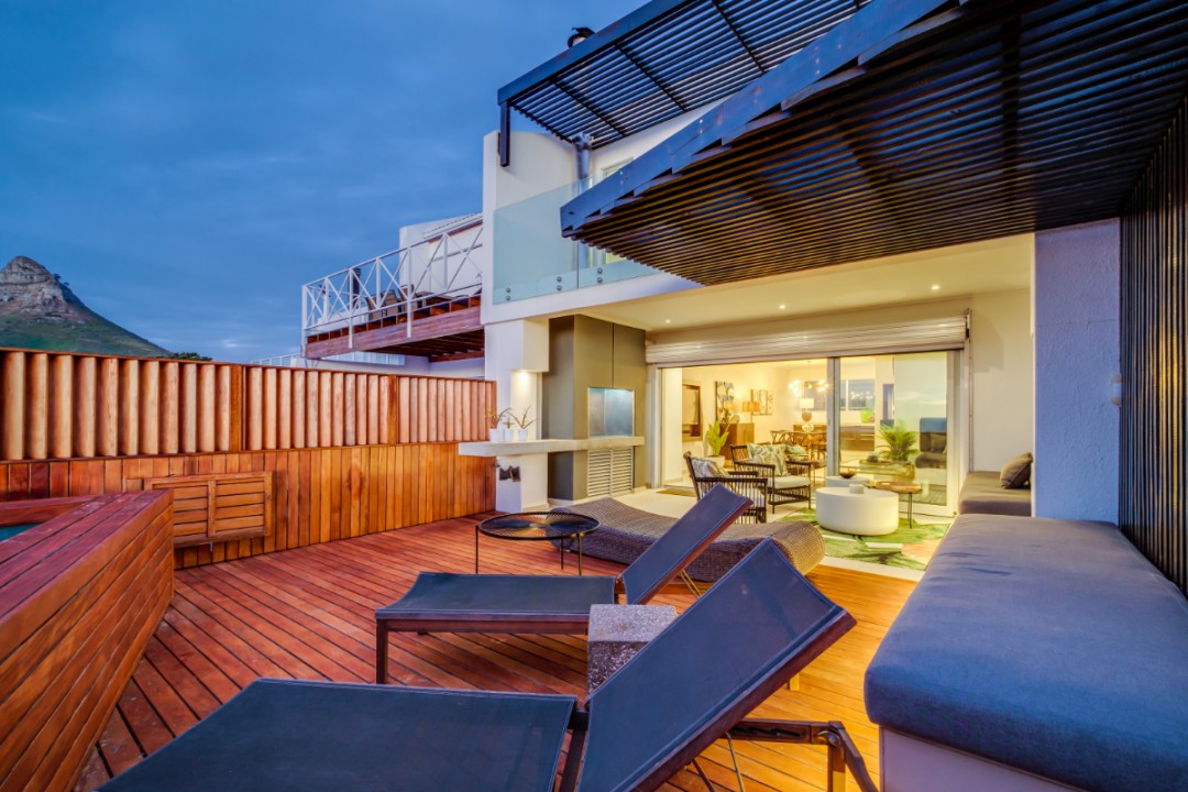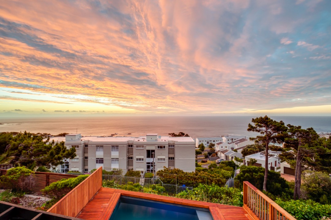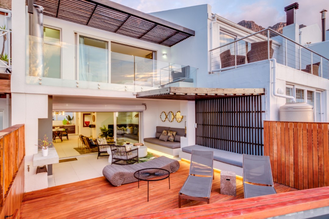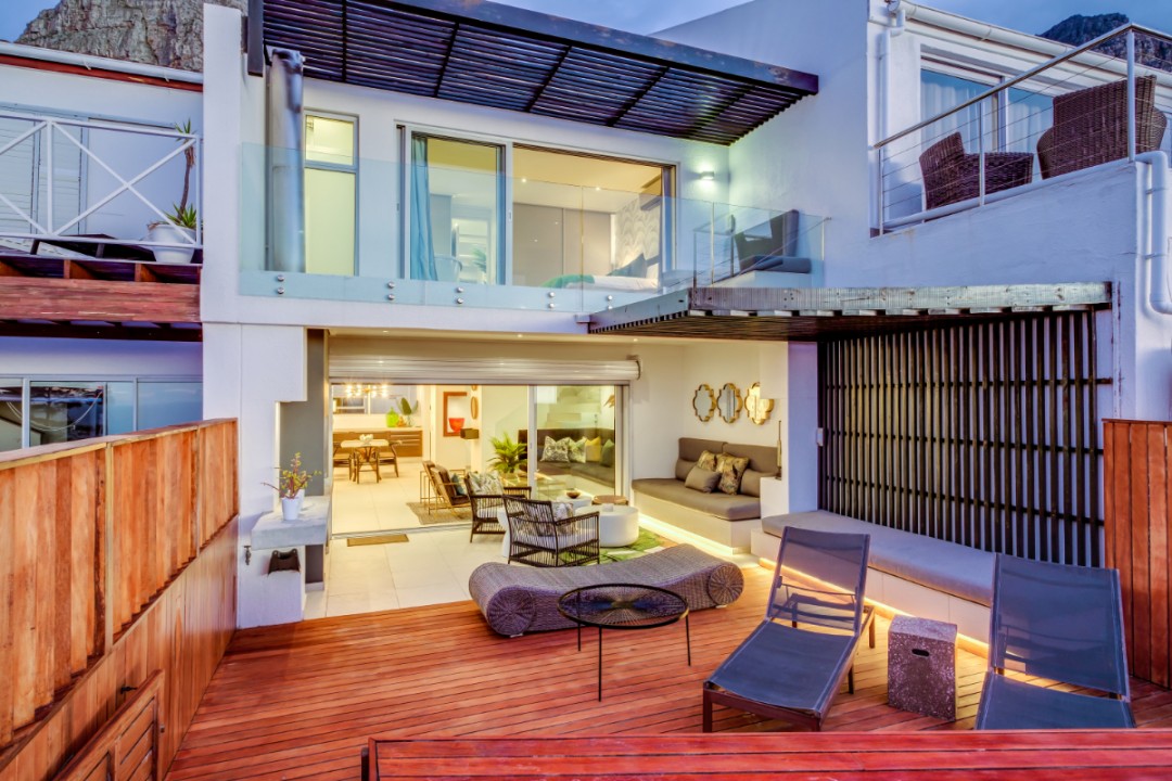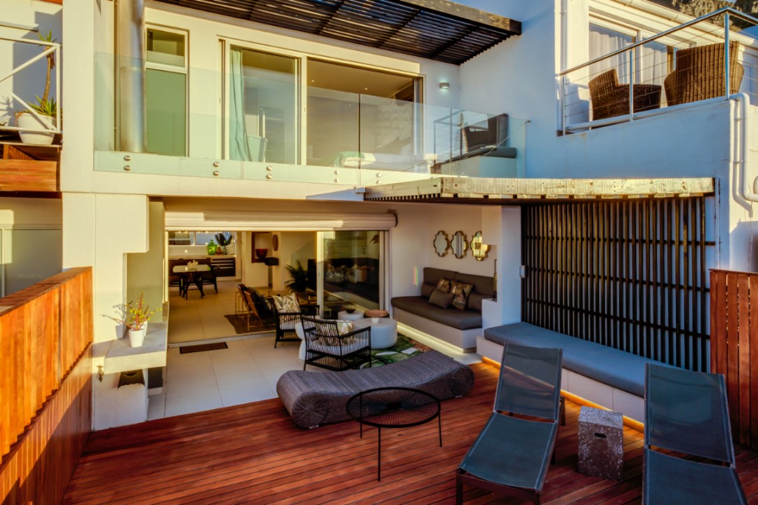 One of a small block of 9 terrace houses, this double story 3 bedroom apartment is situated high up in Camps Bay, in a very quiet, family friendly neighbourhood. It has a lovely outdoor area and incredible sea views. The lower level is an open plan dining and living area which leads onto the large balcony with uninterrupted sea views, a swimming pool and outdoor seating. The well equipped kitchen is towards the back of this level and leads off of the dining area. There is also a guest toilet.