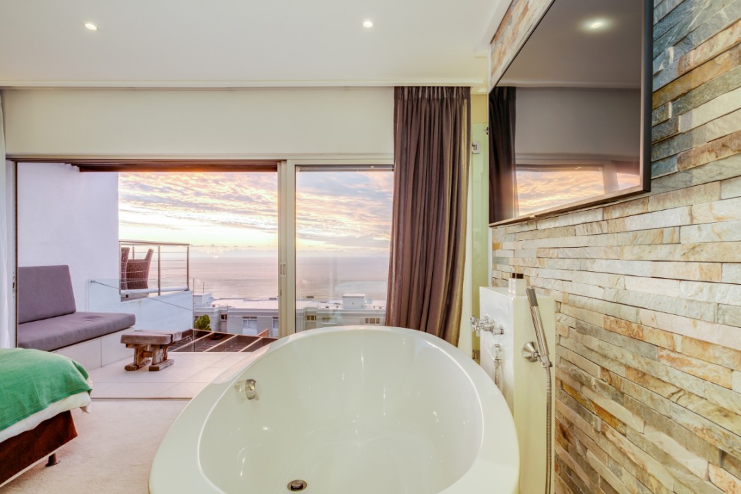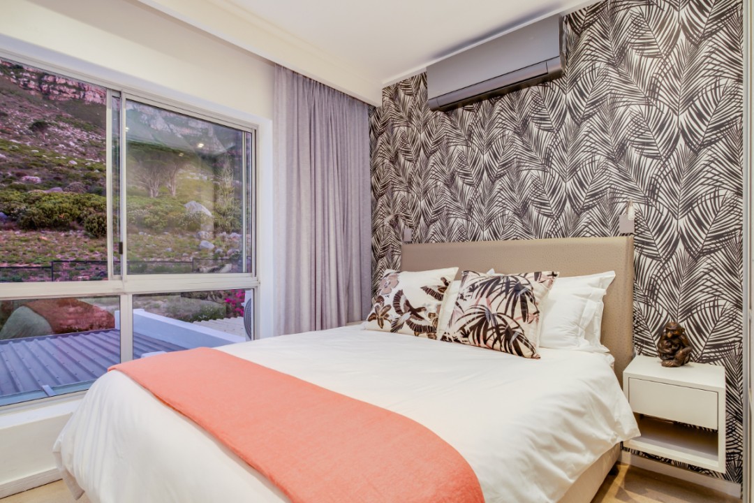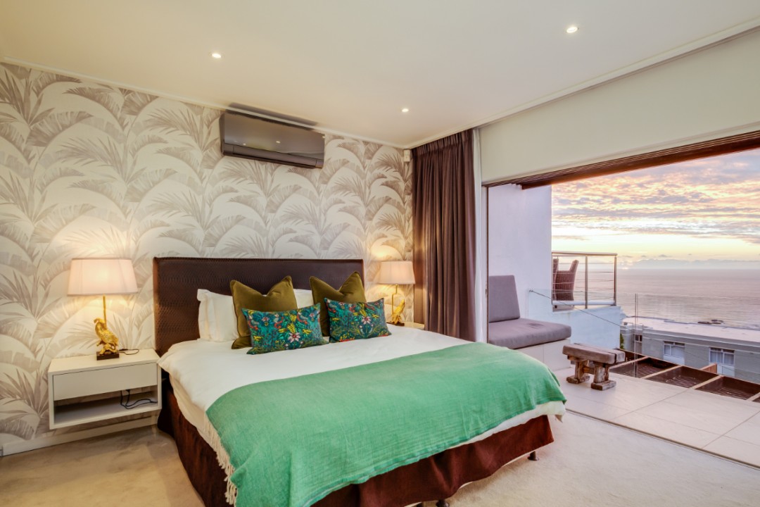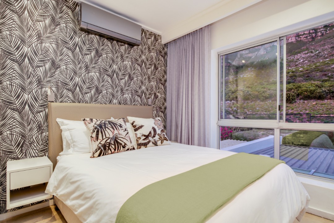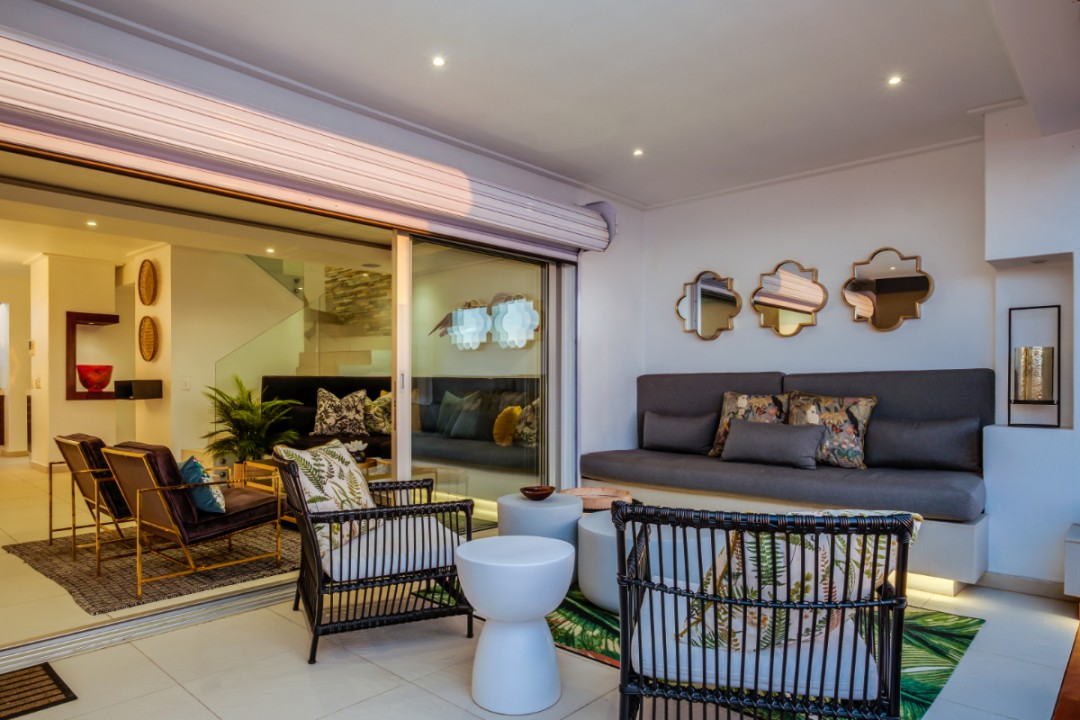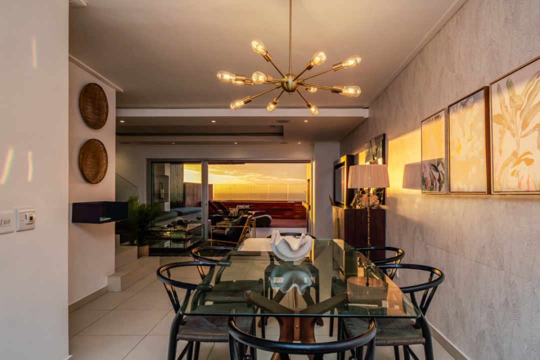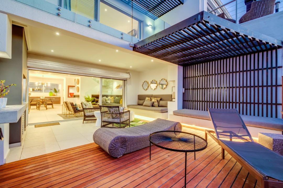 One of a small block of 9 terrace houses, this double story 3 bedroom apartment is situated high up in Camps Bay, in a very quiet, family friendly neighbourhood. It has a lovely outdoor area and incredible sea views. The lower level is an open plan dining and living area which leads onto the large balcony with uninterrupted sea views, a swimming pool and outdoor seating. The well equipped kitchen is towards the back of this level and leads off of the dining area. There is also a guest toilet.