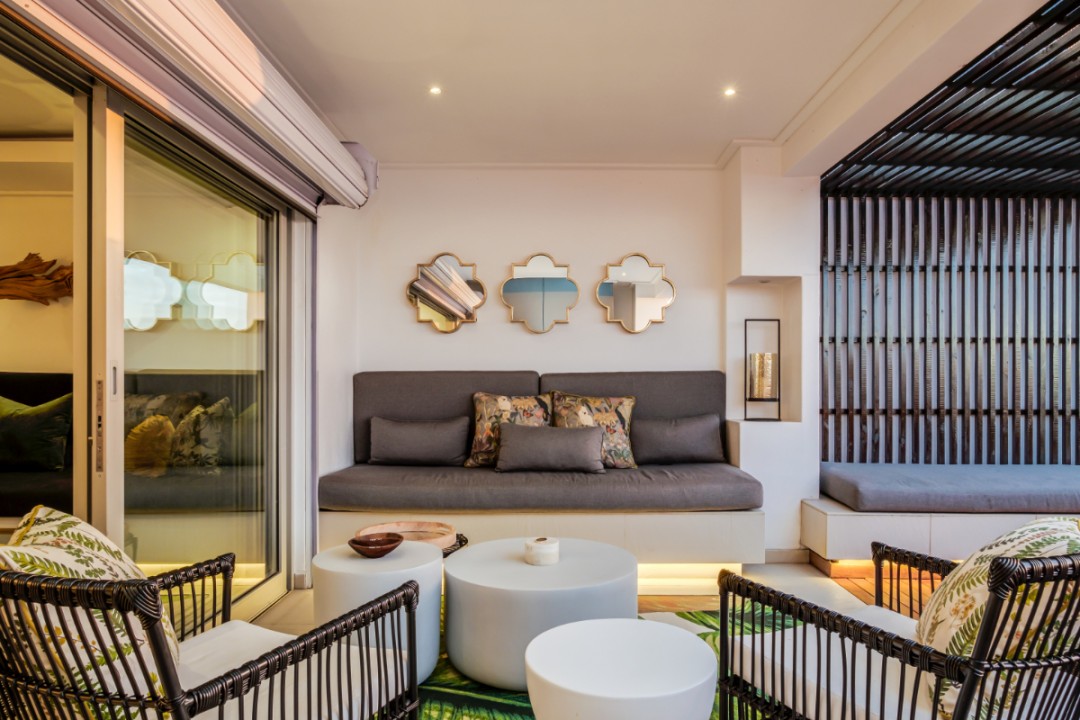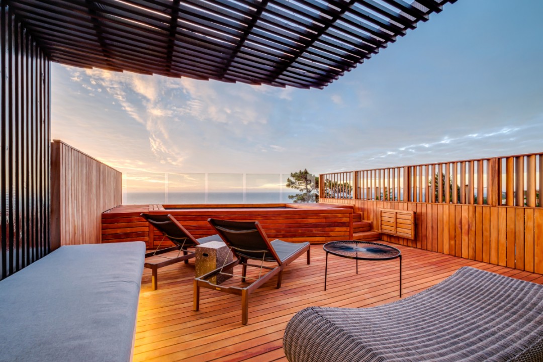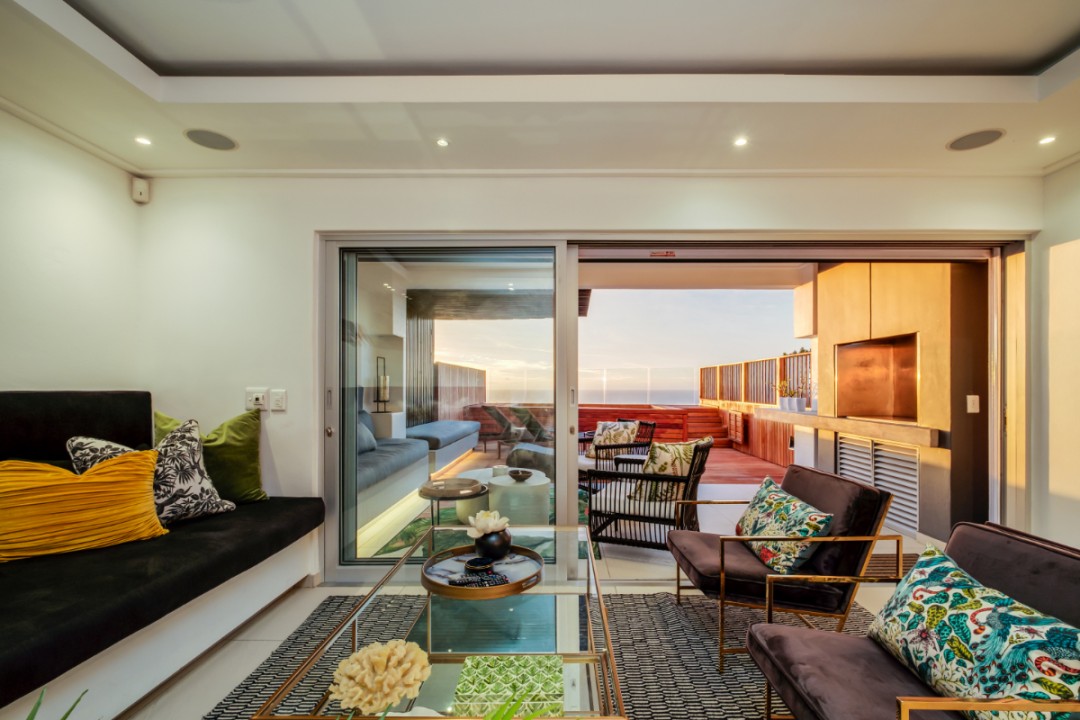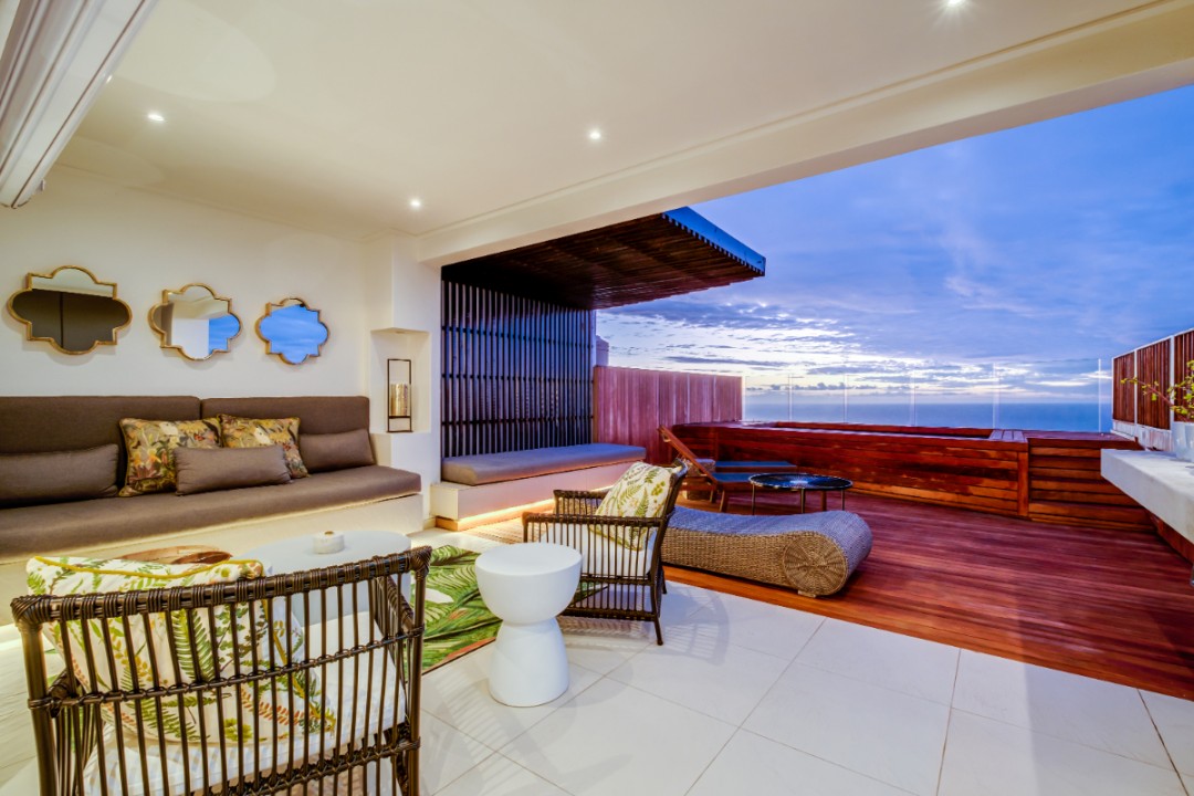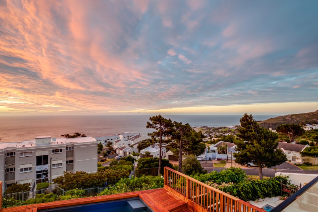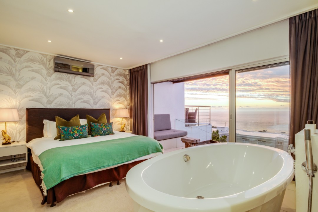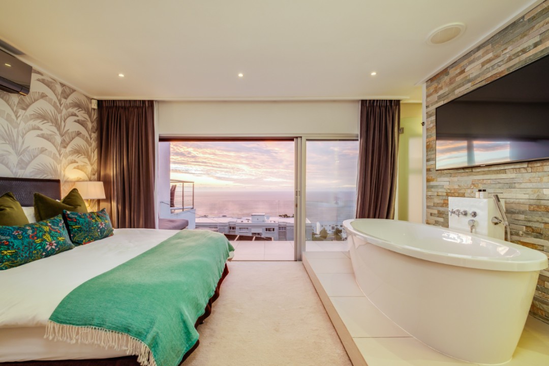 One of a small block of 9 terrace houses, this double story 3 bedroom apartment is situated high up in Camps Bay, in a very quiet, family friendly neighbourhood. It has a lovely outdoor area and incredible sea views. The lower level is an open plan dining and living area which leads onto the large balcony with uninterrupted sea views, a swimming pool and outdoor seating. The well equipped kitchen is towards the back of this level and leads off of the dining area. There is also a guest toilet.
