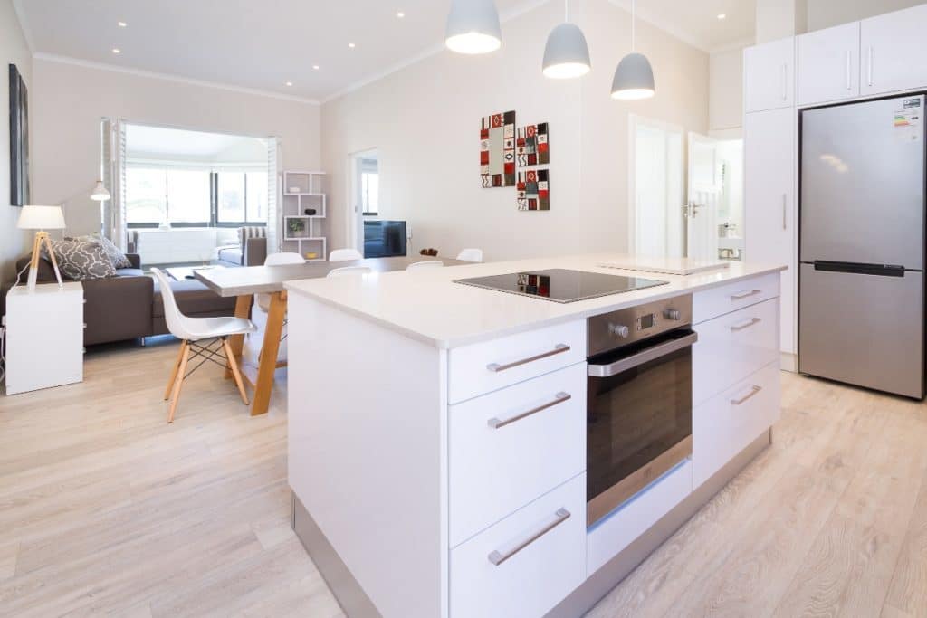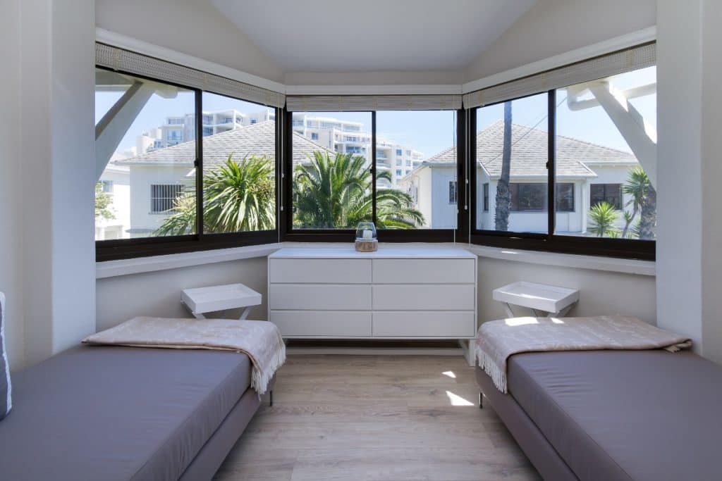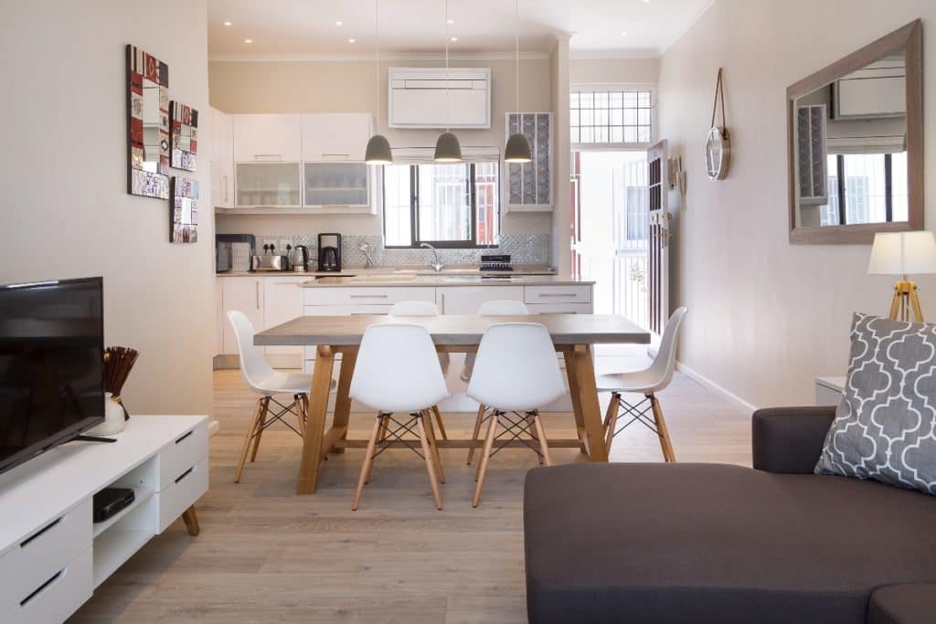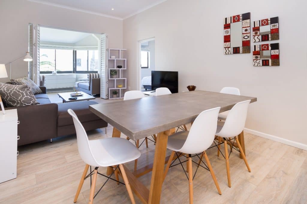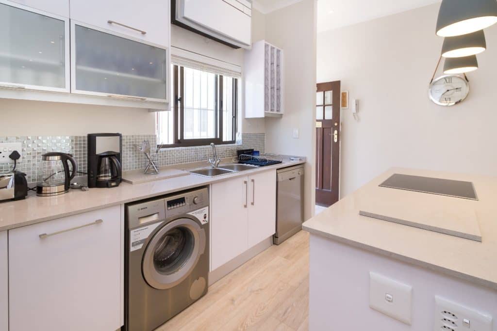 The living and dining area is open plan and flooded with natural sunlight. There is an enticing reading nook with two daybeds, which can be closed off by shutters to create a sun room. The lounge has a large L-shaped couch and TV with DSTV, this flows into the dining area with seating for 6 and finally there is a fully equipped kitchen with a dishwasher and Nespresso coffee machine.