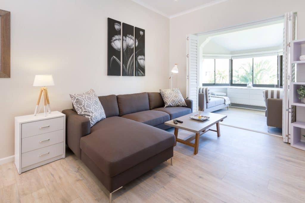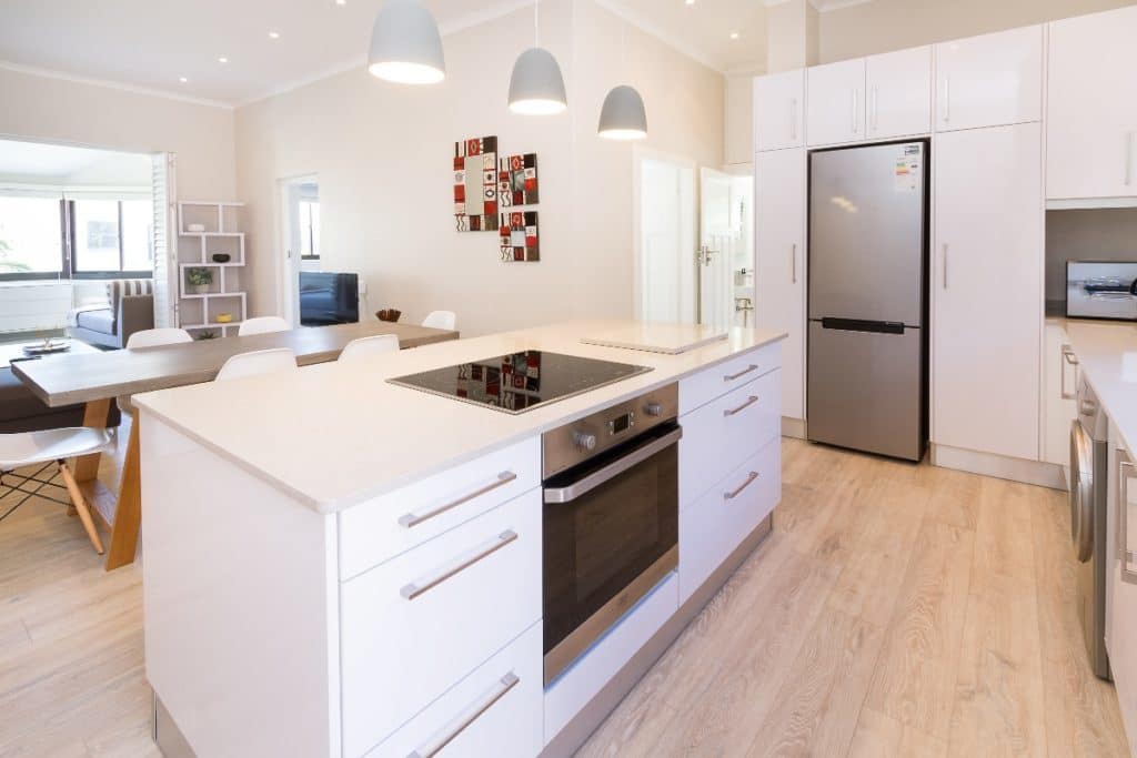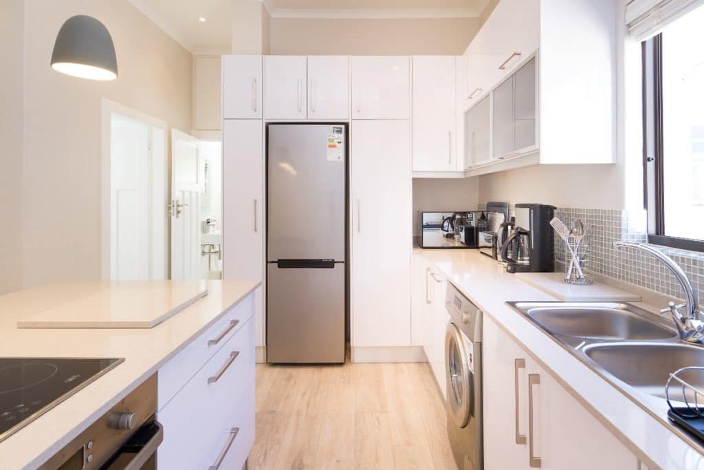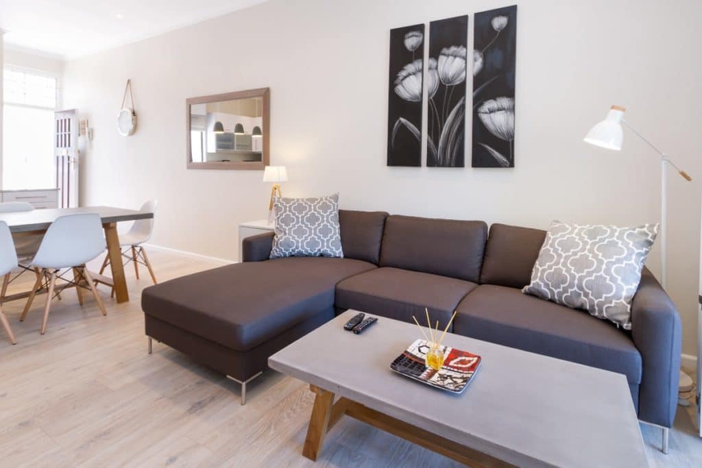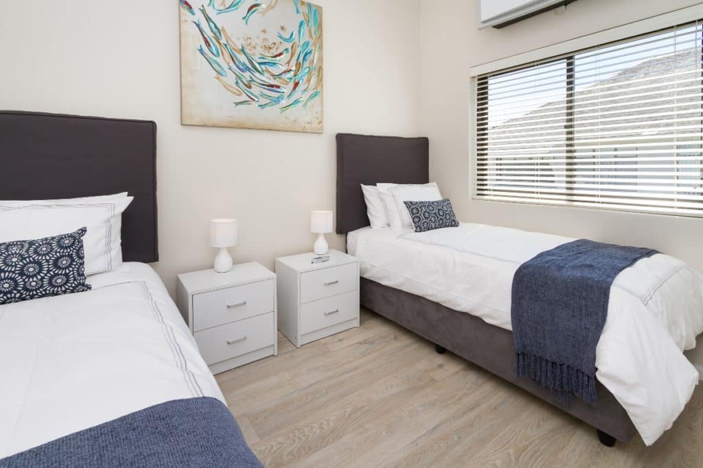 The living and dining area is open plan and flooded with natural sunlight. There is an enticing reading nook with two daybeds, which can be closed off by shutters to create a sun room. The lounge has a large L-shaped couch and TV with DSTV, this flows into the dining area with seating for 6 and finally there is a fully equipped kitchen with a dishwasher and Nespresso coffee machine.