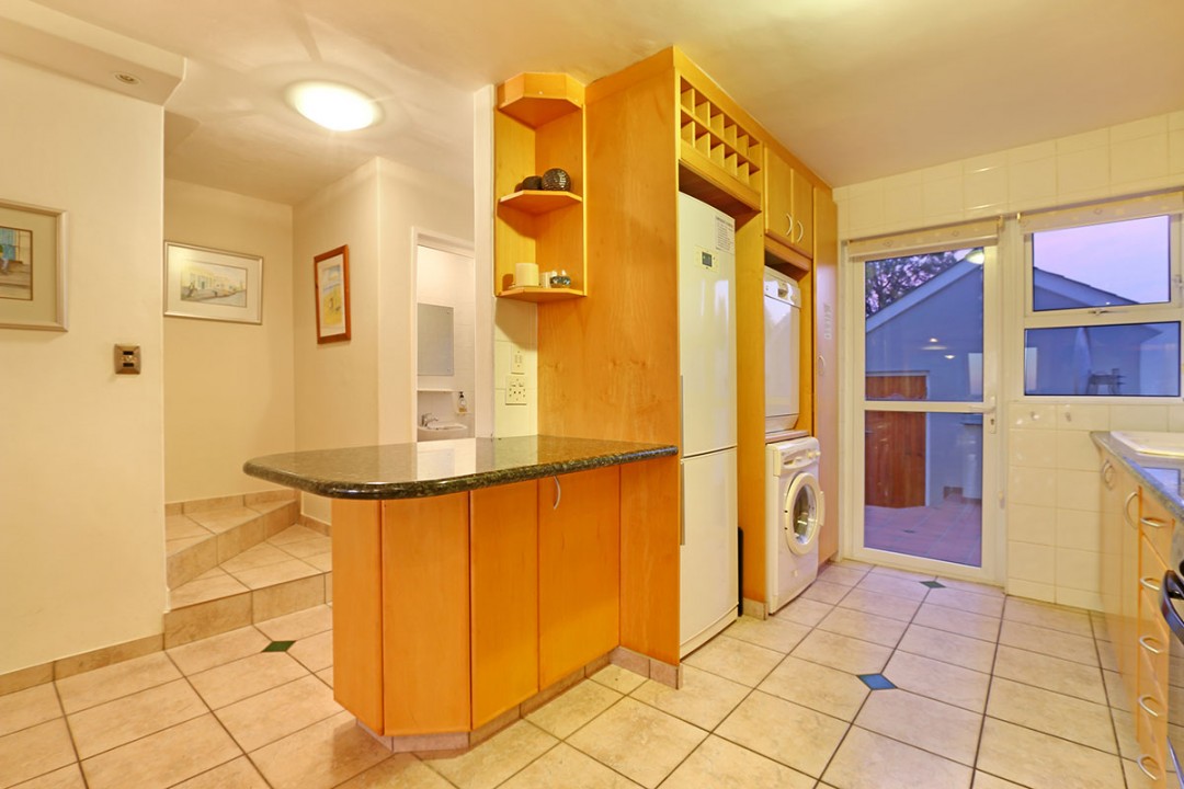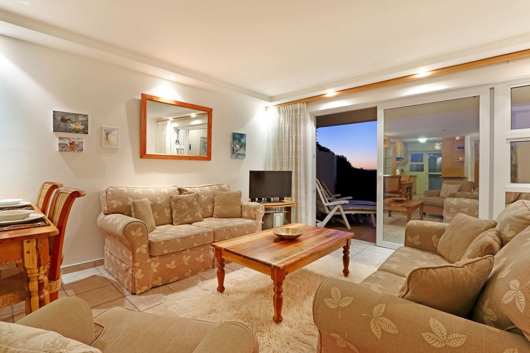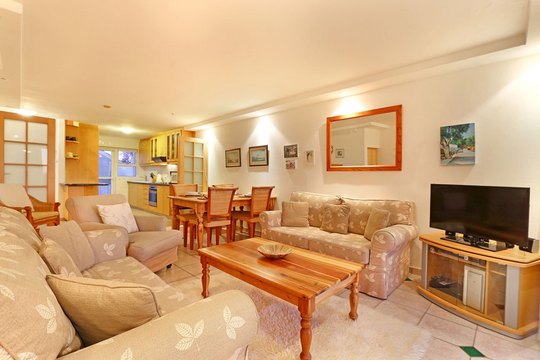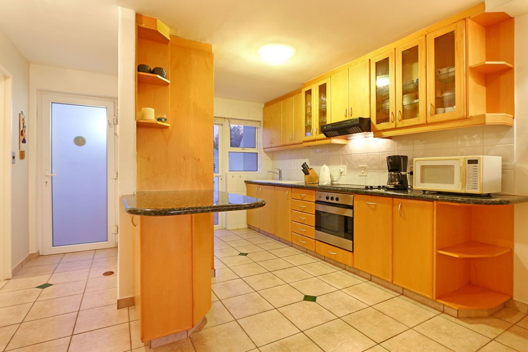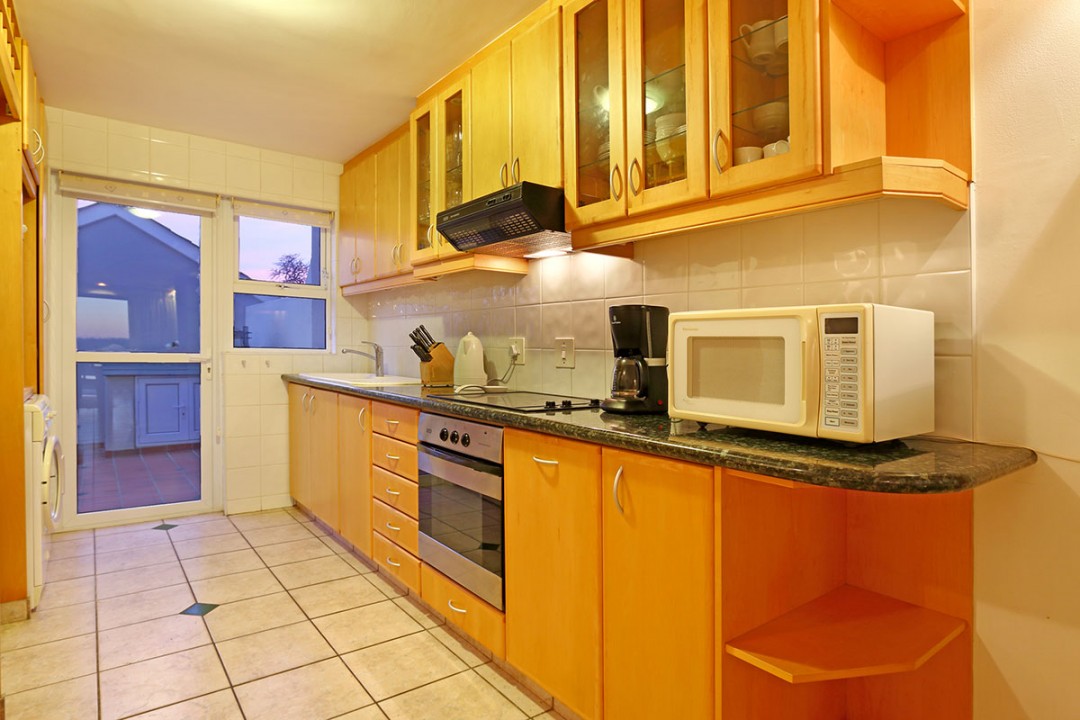 The main interior of the property includes an open plan kitchen, dining area, and lounge that lead out to a private garden with amazing views of the Ocean and Mountain. The kitchen is fully equipped with an oven and hob, a microwave, fridge and freezer, washing machine and dishwasher.