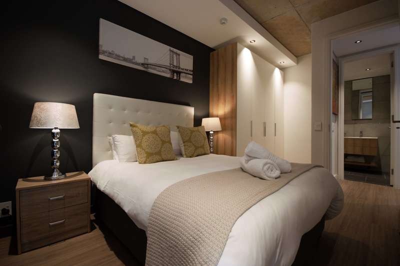 Open plan living in a contemporary one bedroom apartment. Apartment includes an open plan kitchen with a dining table and a lounge area. It also comes with a flat-screen TV with satellite channels and a modern bathroom.