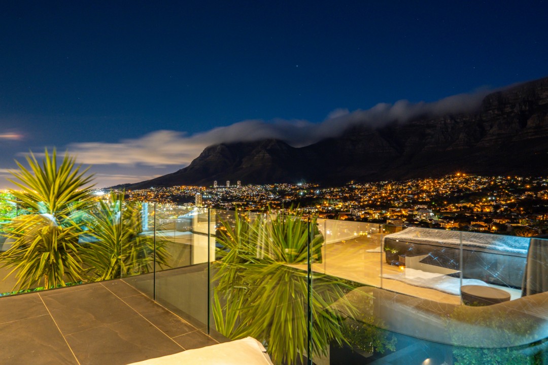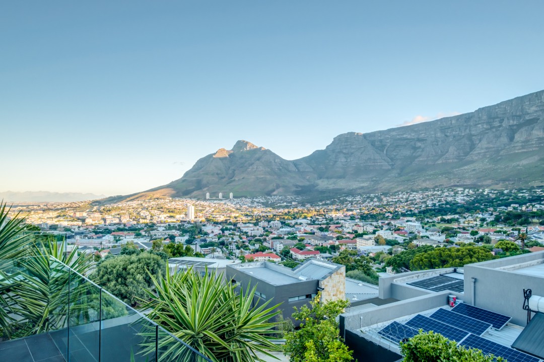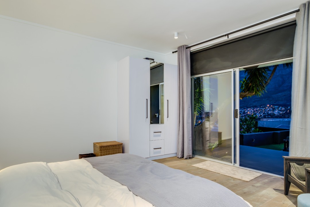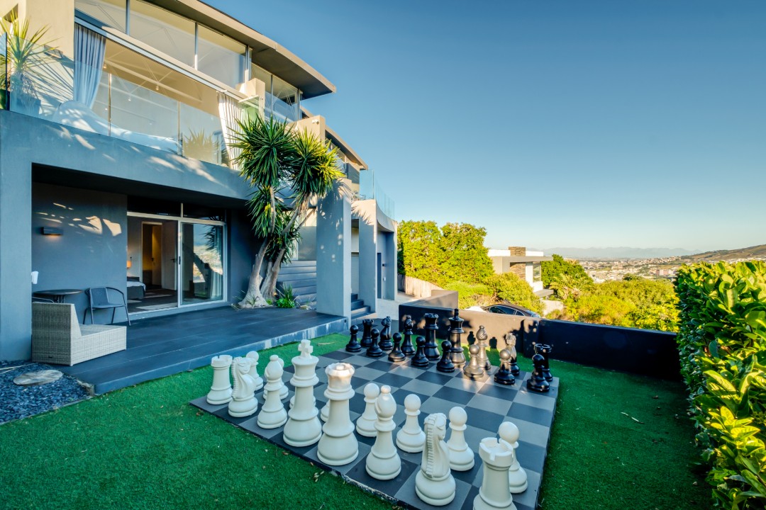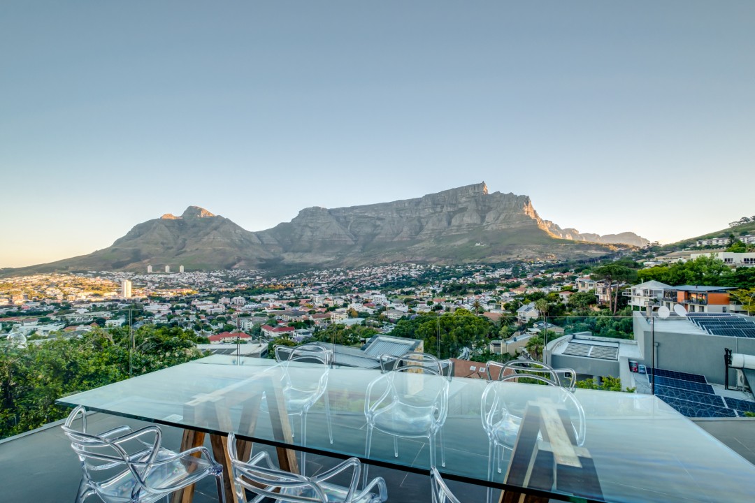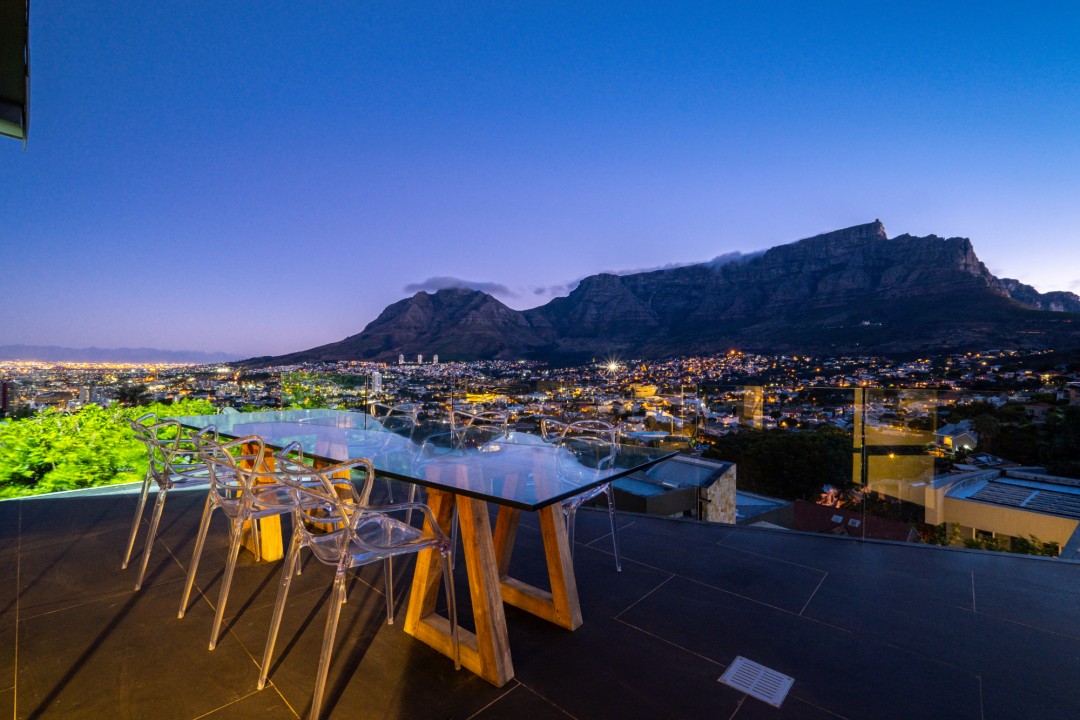Gorgeously styled, double storey home in the heart of Cape Town. This beautiful property has some of the most exquisite views of Table Mountain and the city below. The large, open-plan living area had double volume ceilings and glass stacking doors to maximise the views and outdoor spaces. The fully equipped kitchen is modern and stylish. The master bedroom leads off the living area. View Table Mountain from the comfort of the King size bed. Enjoy the spacious open-plan bathroom and walk-in closet. This room also has a private balcony. The second and third bedrooms are on the ground floor and lead onto the courtyard with an oversized chess board. These two rooms share a bathroom. The balcony off the lounge has outdoor dining and amazing views. The backyard has a large swimming pool, cabana, fire pit and more outdoor seating.