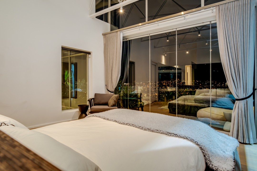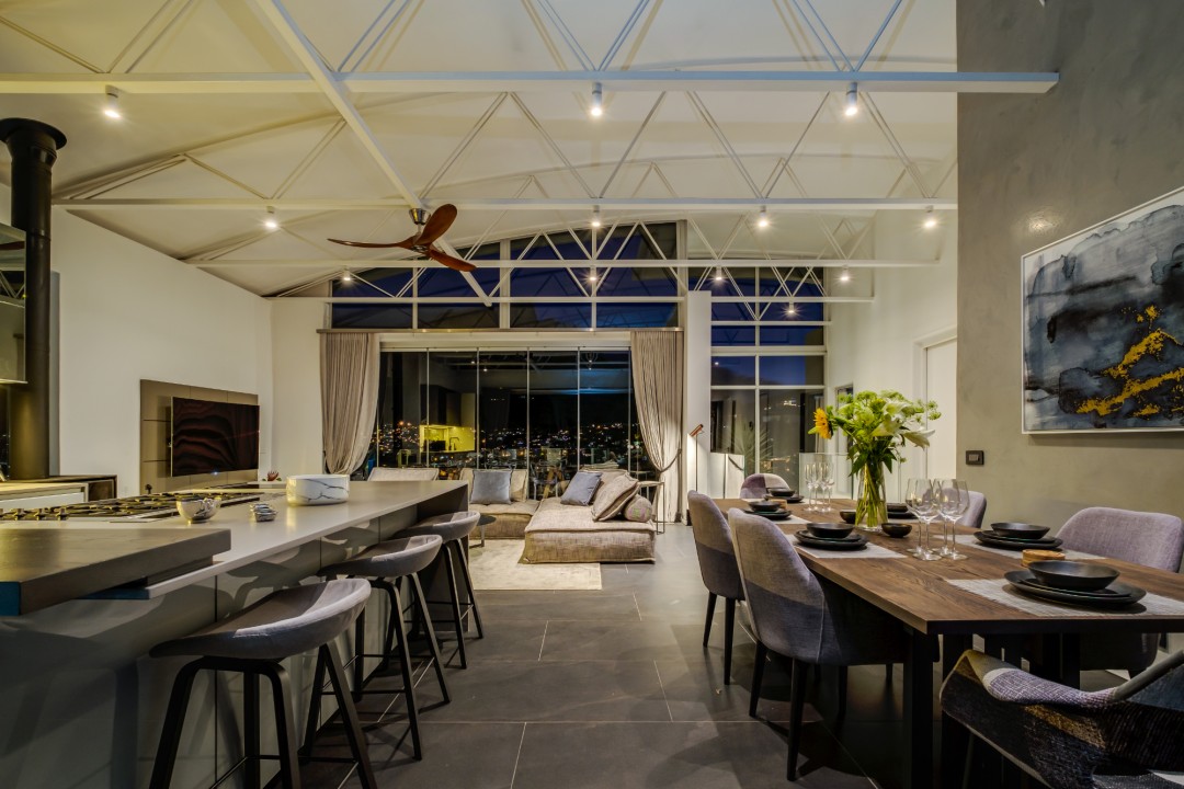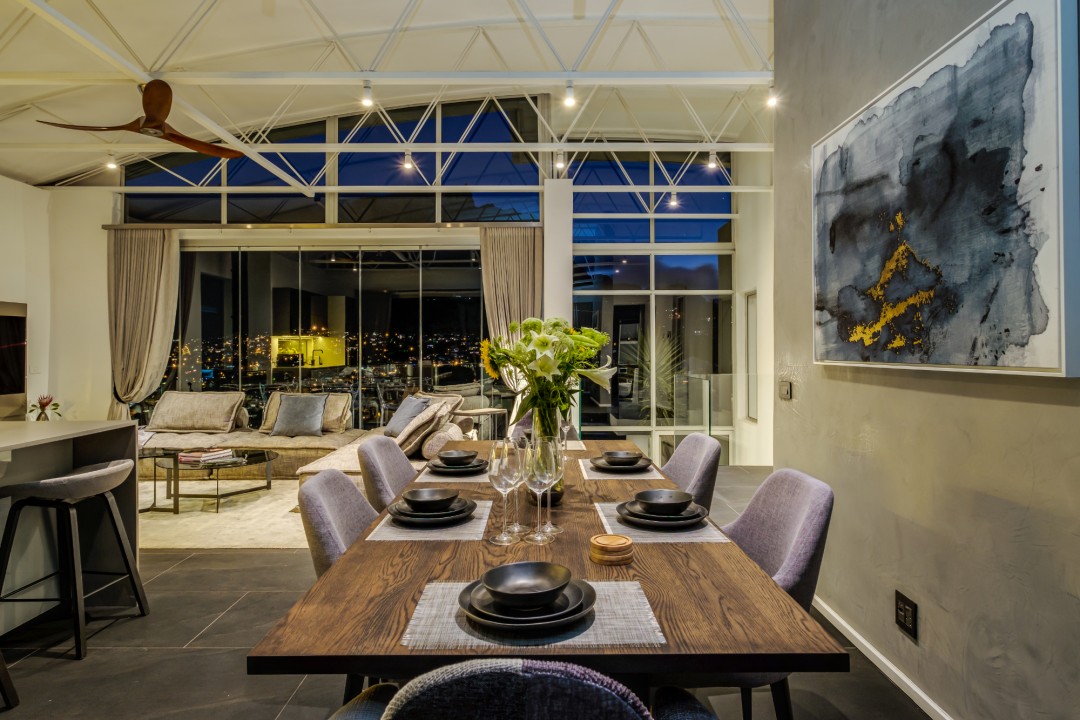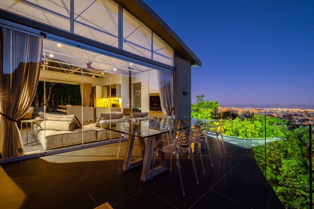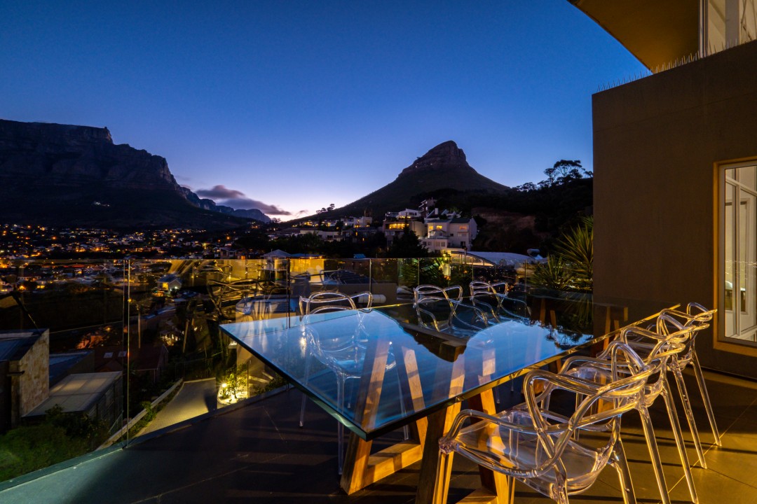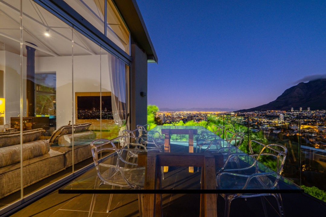 Gorgeously styled, double storey home in the heart of Cape Town. This beautiful property has some of the most exquisite views of Table Mountain and the city below. The large, open-plan living area had double volume ceilings and glass stacking doors to maximise the views and outdoor spaces. The fully equipped kitchen is modern and stylish. The master bedroom leads off the living area. View Table Mountain from the comfort of the King size bed. Enjoy the spacious open-plan bathroom and walk-in closet. This room also has a private balcony. The second and third bedrooms are on the ground floor and lead onto the courtyard with an oversized chess board. These two rooms share a bathroom. The balcony off the lounge has outdoor dining and amazing views. The backyard has a large swimming pool, cabana, fire pit and more outdoor seating.