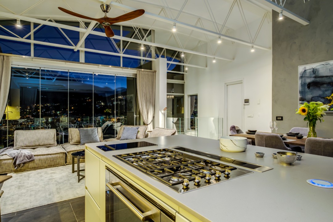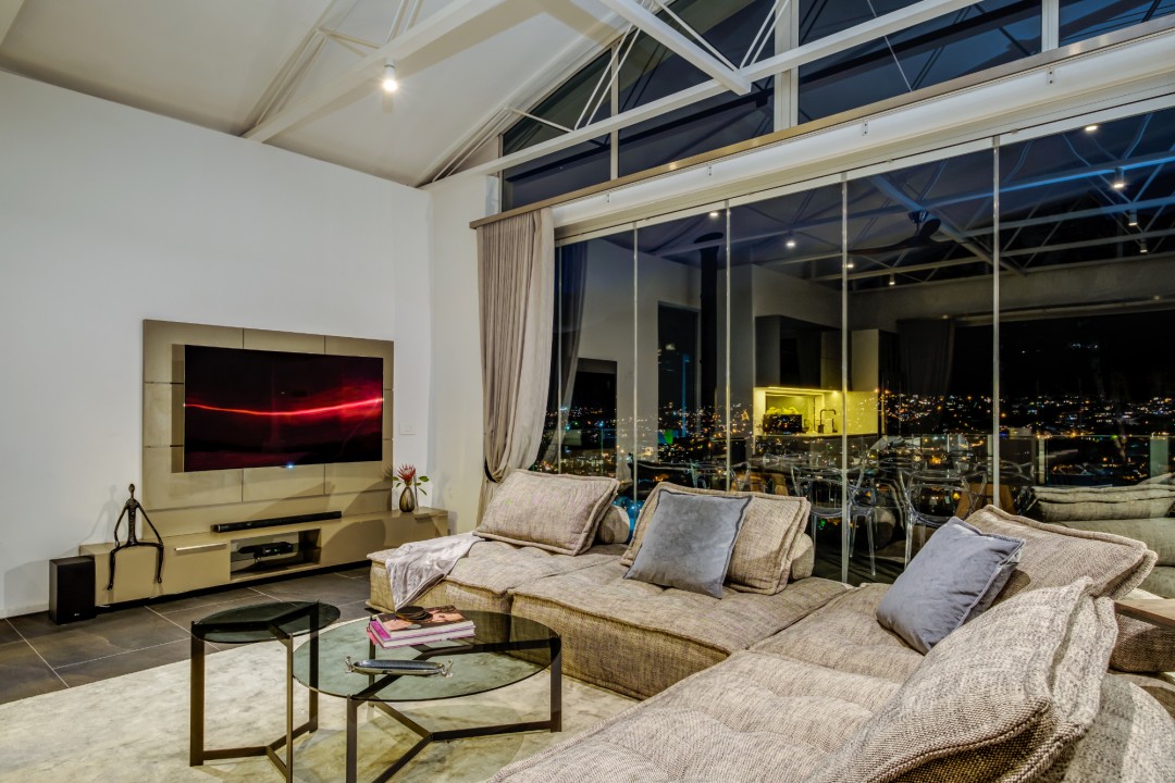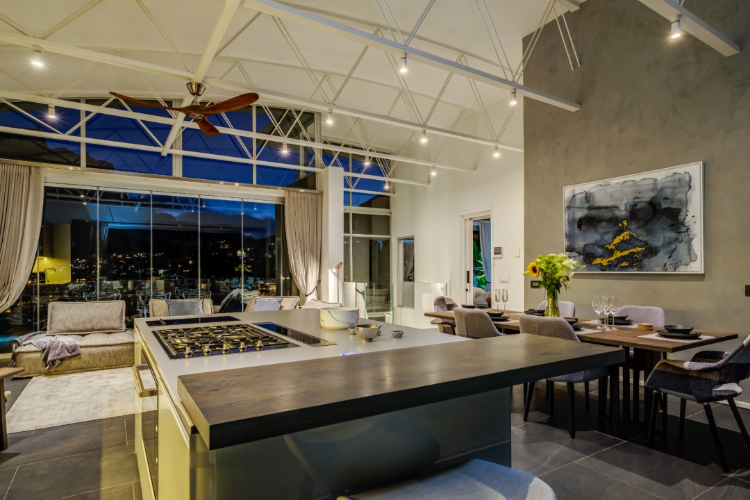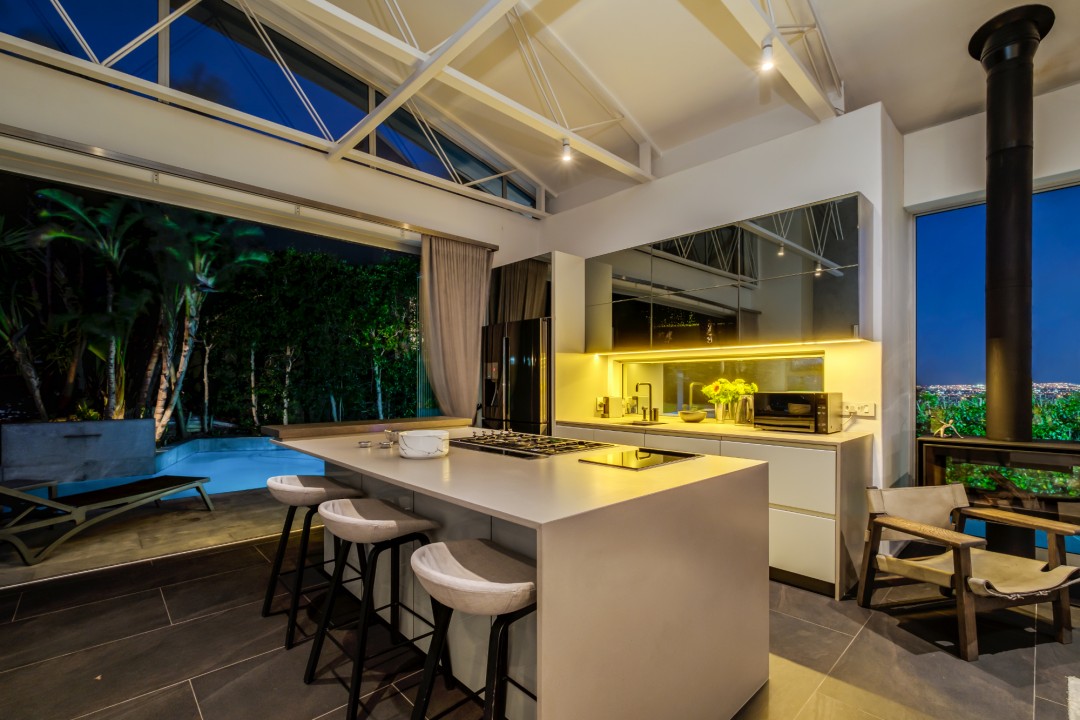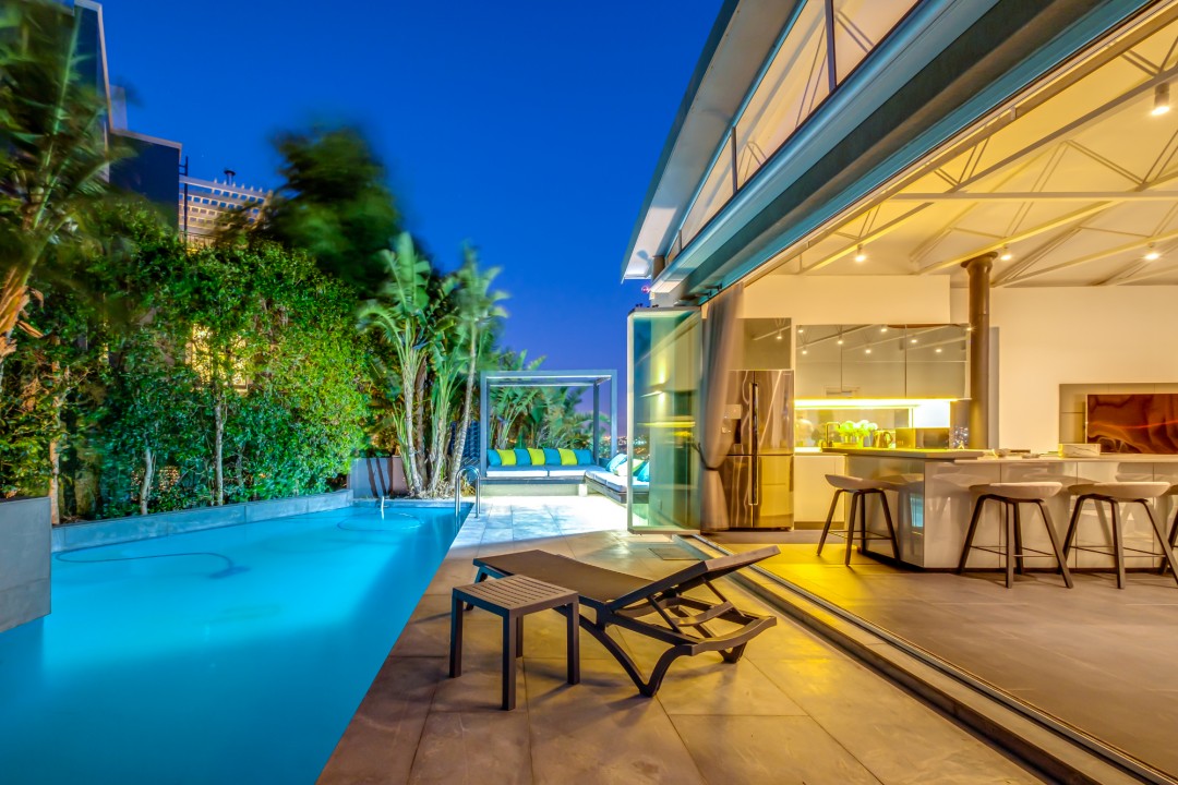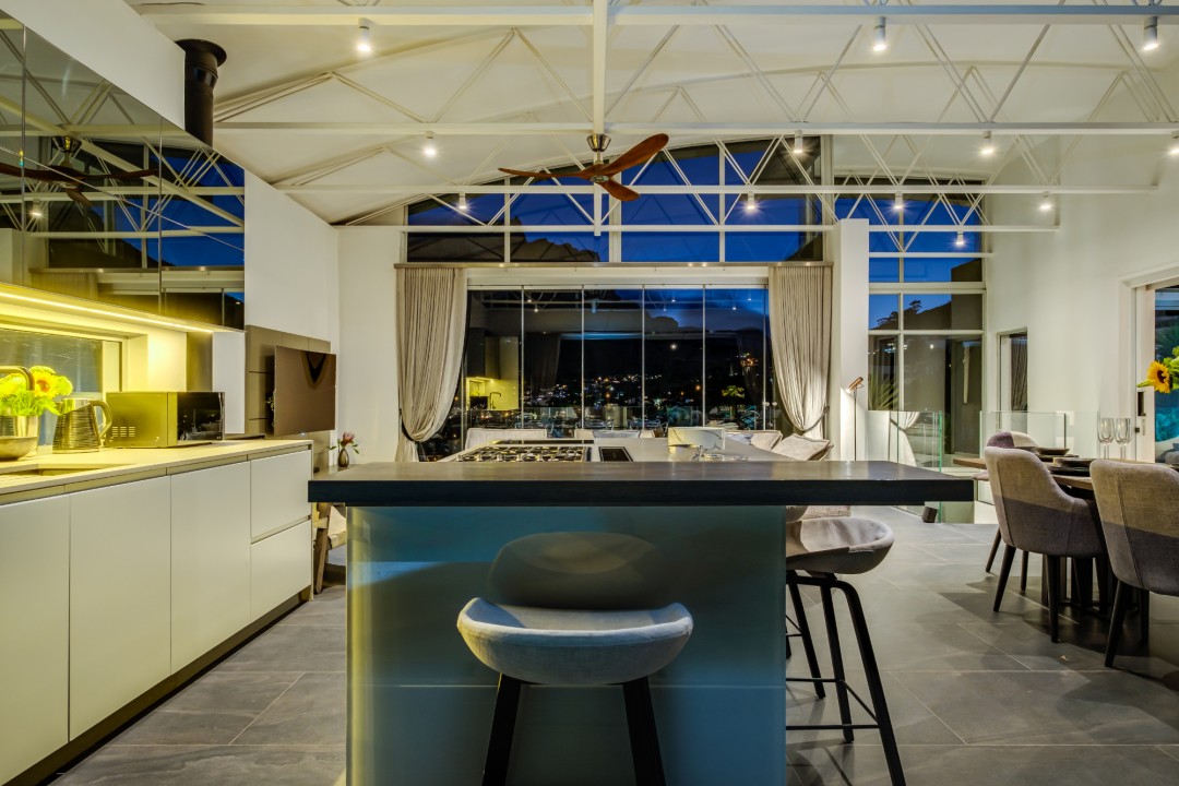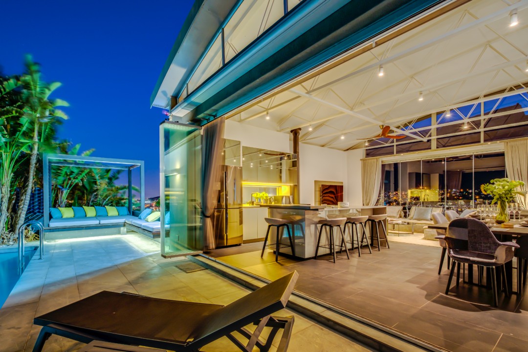 Gorgeously styled, double storey home in the heart of Cape Town. This beautiful property has some of the most exquisite views of Table Mountain and the city below. The large, open-plan living area had double volume ceilings and glass stacking doors to maximise the views and outdoor spaces. The fully equipped kitchen is modern and stylish. The master bedroom leads off the living area. View Table Mountain from the comfort of the King size bed. Enjoy the spacious open-plan bathroom and walk-in closet. This room also has a private balcony. The second and third bedrooms are on the ground floor and lead onto the courtyard with an oversized chess board. These two rooms share a bathroom. The balcony off the lounge has outdoor dining and amazing views. The backyard has a large swimming pool, cabana, fire pit and more outdoor seating.