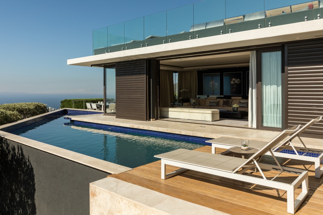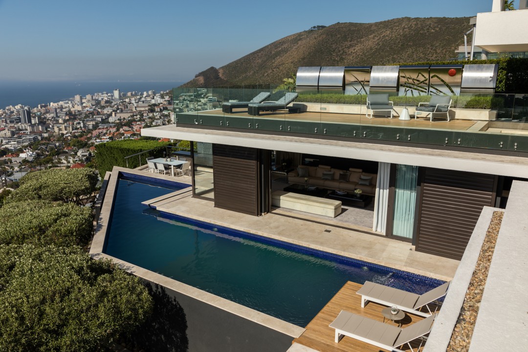 Moondance is filled with an endless list of distinctive features which coupled with Stefan Antoni’s careful consideration to facilities and functionality provides the perfect residence for an unrivalled, multi-sensory vacation. Bold, dramatic architectural features like the unique staircase above an indoor water feature are met with incredible finishes and furniture throughout the home. The koi pond, indoor cinema, spit braai, pizza oven and multiple private, outdoor entertainment areas are world class bonuses to this property.