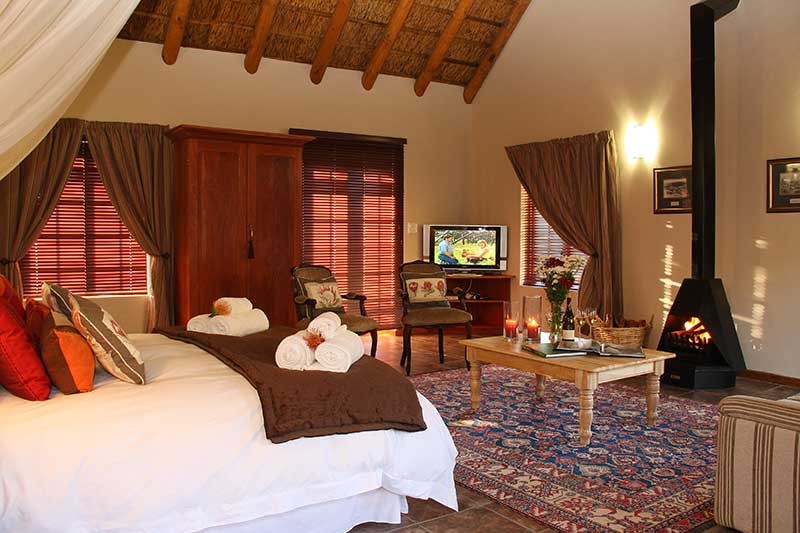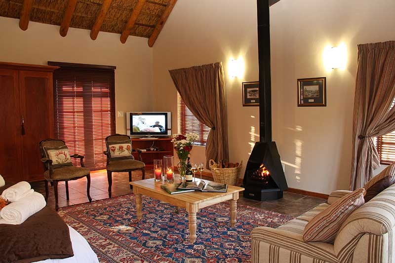 Ochre and cream colours create a warm, romantic atmosphere. Curl up in the queen size bed or, relax next to the fire on the welcoming couch or enjoy the sunset on the veranda with a glass of wine or take in the breathtaking vistas from your private swimming pool.