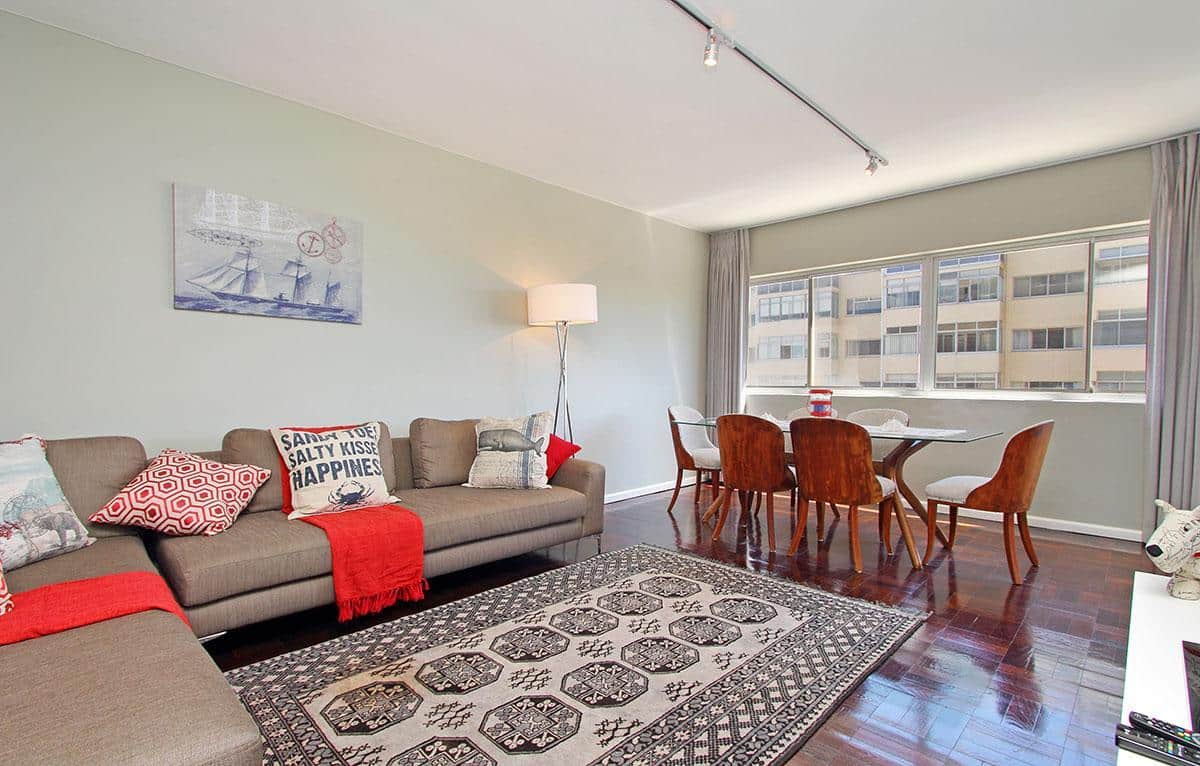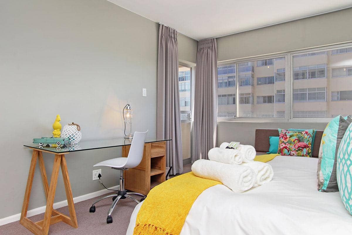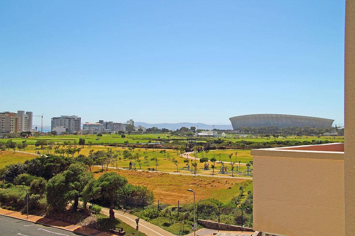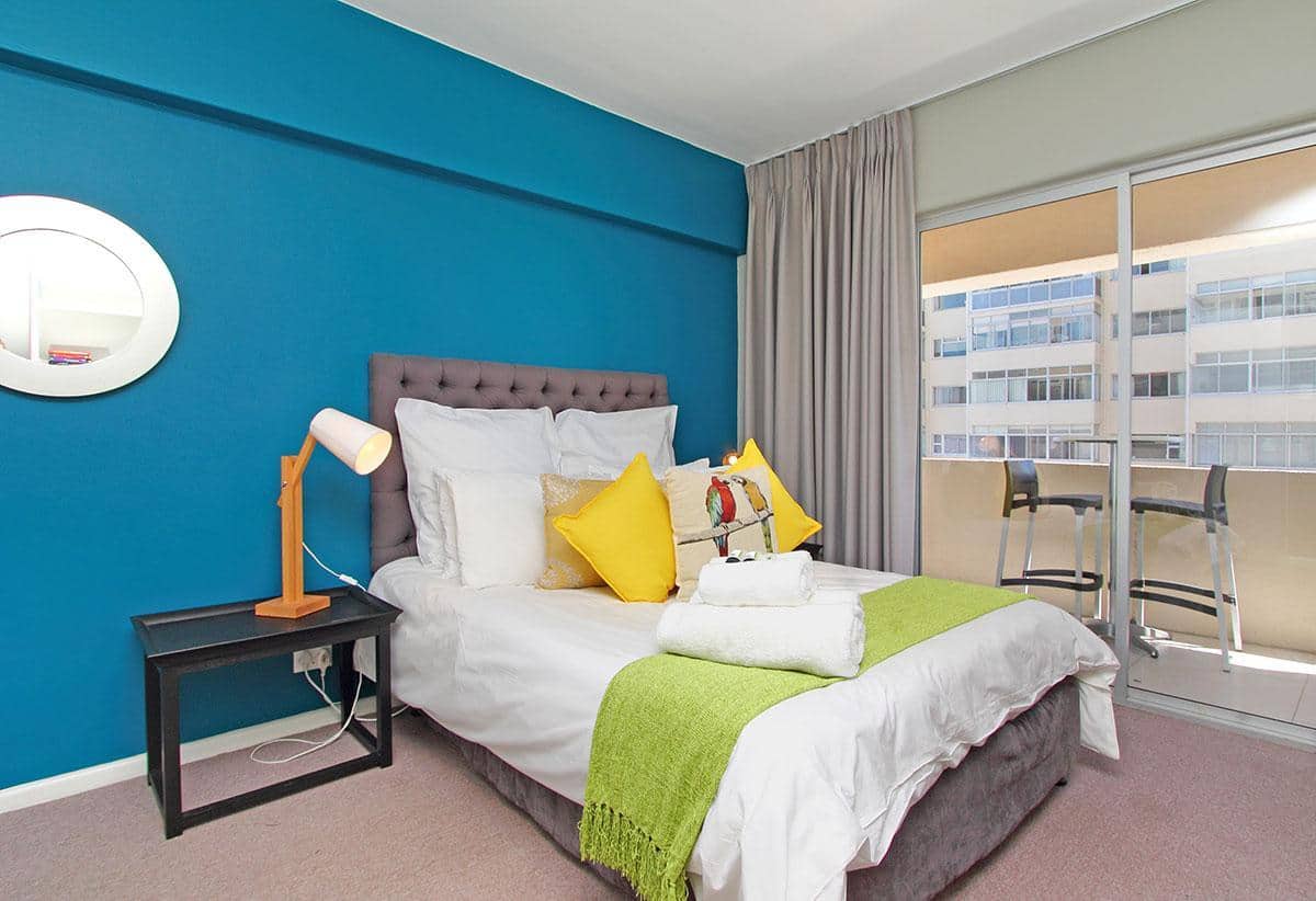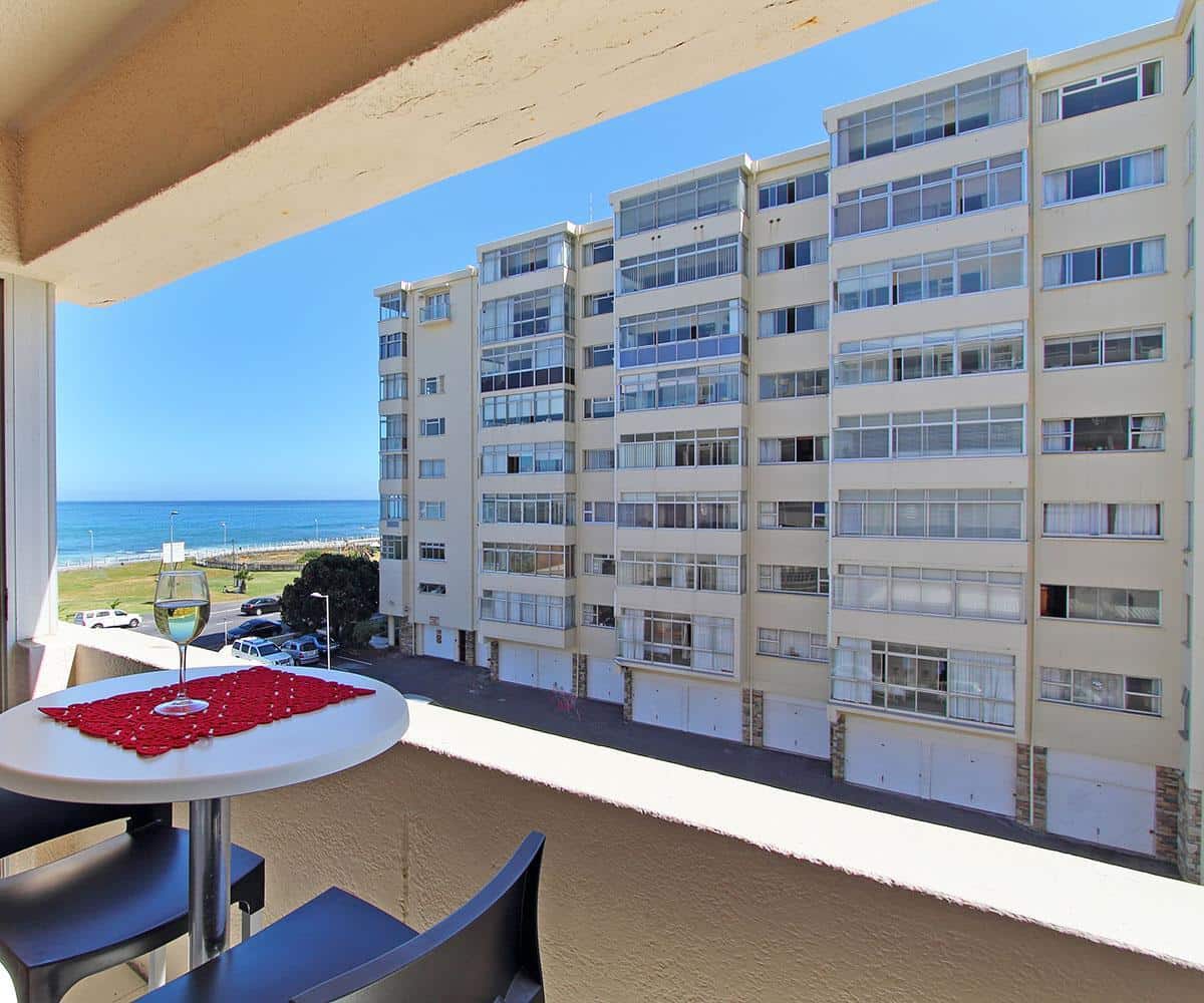 Opposite the ocean and close to lots of restaurants and coffee shops in Mouillepoint and the V&A Waterfront shopping centre and restaurants, it has the benefit of being both close to the ocean and also close to the city. This makes it the ideal holiday rental apartment location for either tourises or corporate clients. The apartment has an open balcony with good ocean views. It also has views of the Eco-park in Green Point.