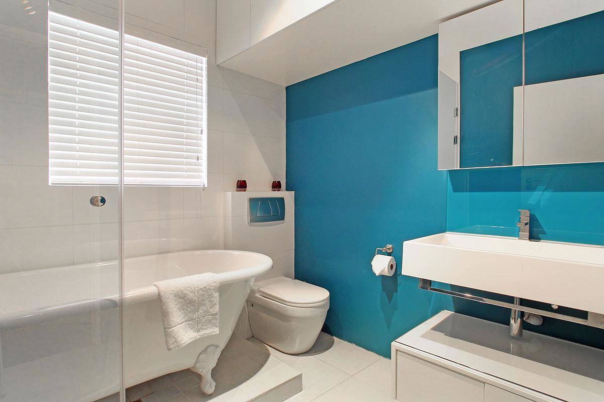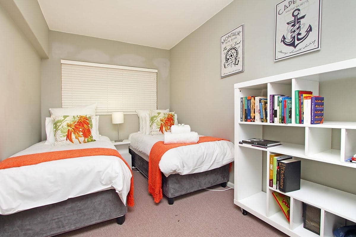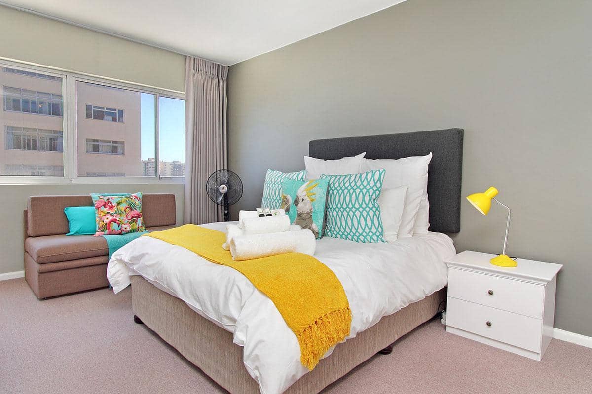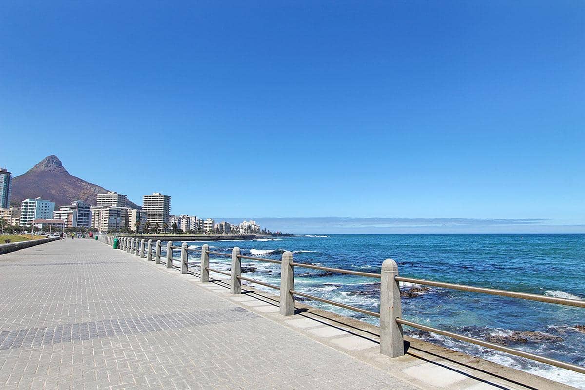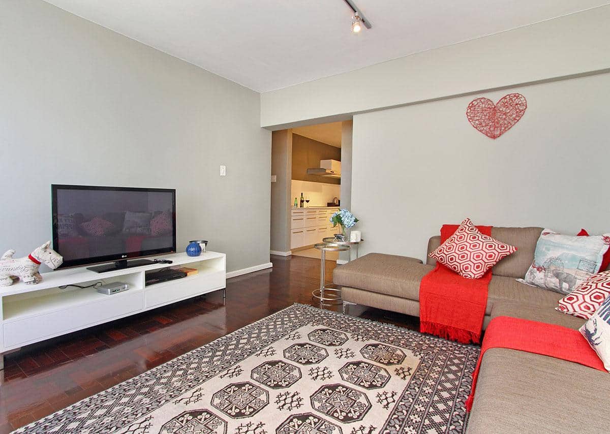 Opposite the ocean and close to lots of restaurants and coffee shops in Mouillepoint and the V&A Waterfront shopping centre and restaurants, it has the benefit of being both close to the ocean and also close to the city. This makes it the ideal holiday rental apartment location for either tourises or corporate clients. The apartment has an open balcony with good ocean views. It also has views of the Eco-park in Green Point.