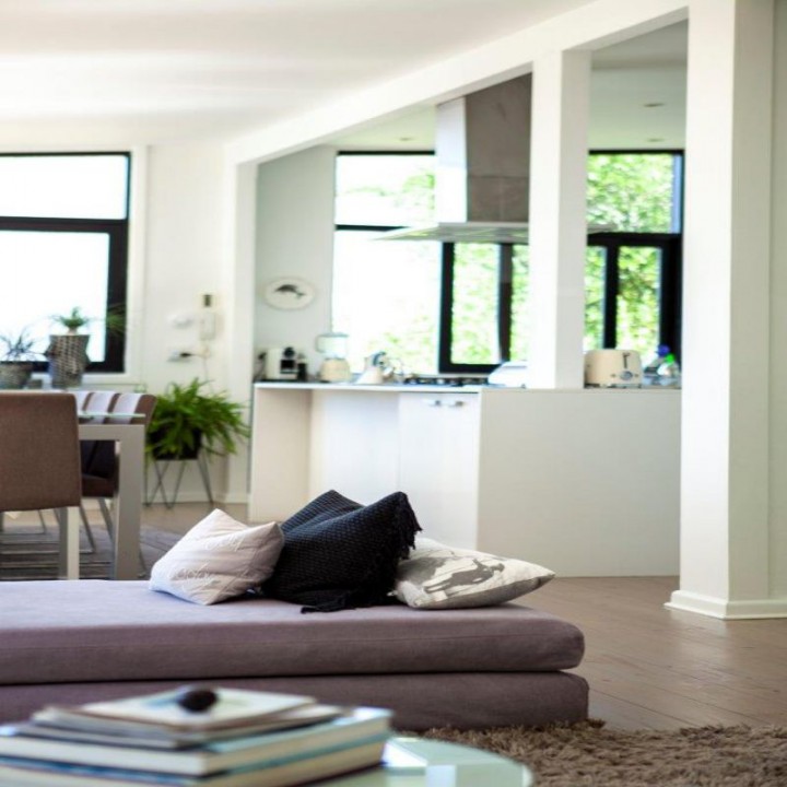 Super spacious open plan living area with a 10-seater dining table, formal lounge and tv area.