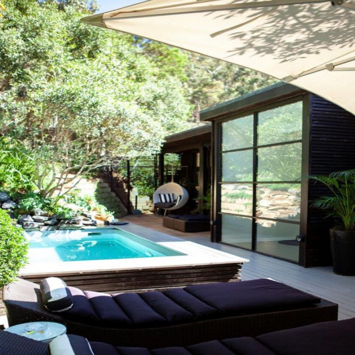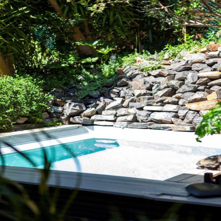 Lovely pool surrounded by lush green forest vegetation with a bbq/braai.