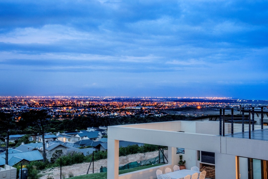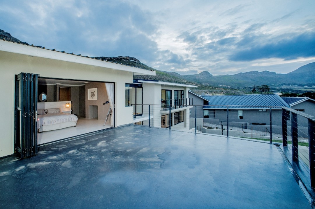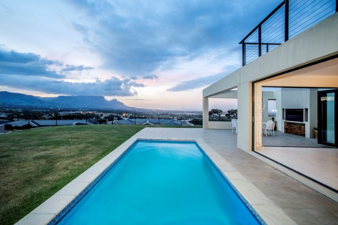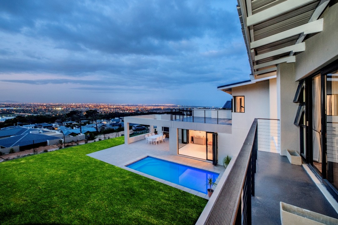 This modern double-story home overlooks the Constantia Valley and is ideally suited for relaxing family holidays. It is situated in a security estate which is nestled on the slopes of the Silvermine mountains. The house is close to some of the best wine farms, golf courses, forests and beaches Cape Town has to offer. The home consists of 4 bedrooms, 3 with ensuite bathrooms and all with their own private balcony. The kitchen, dining and lounge areas flow into one another and are perfect for cooking up a storm while entertaining guests. The pool and braai area have an incredible view and are great for outside entertaining.