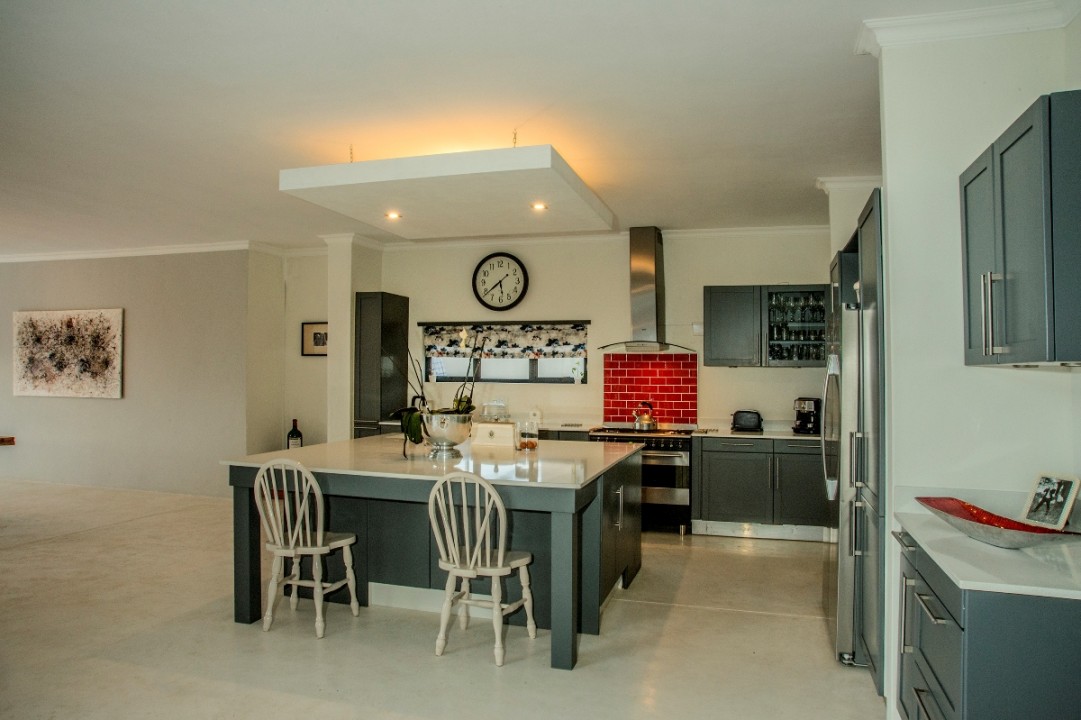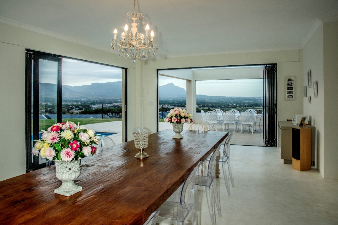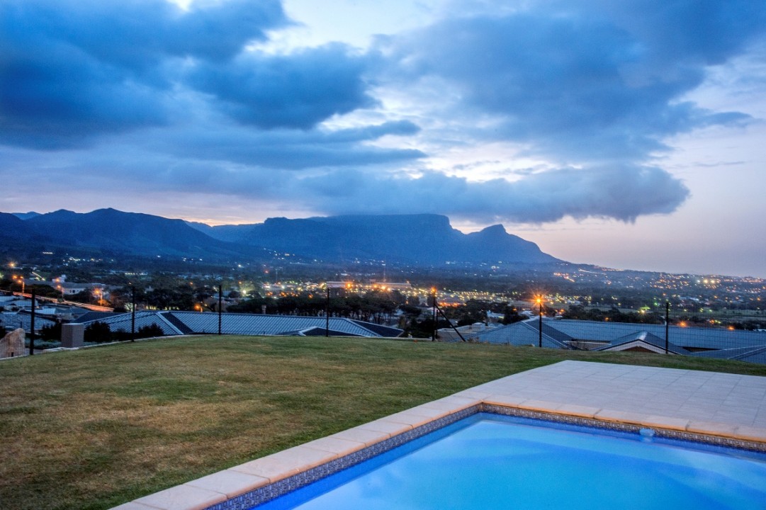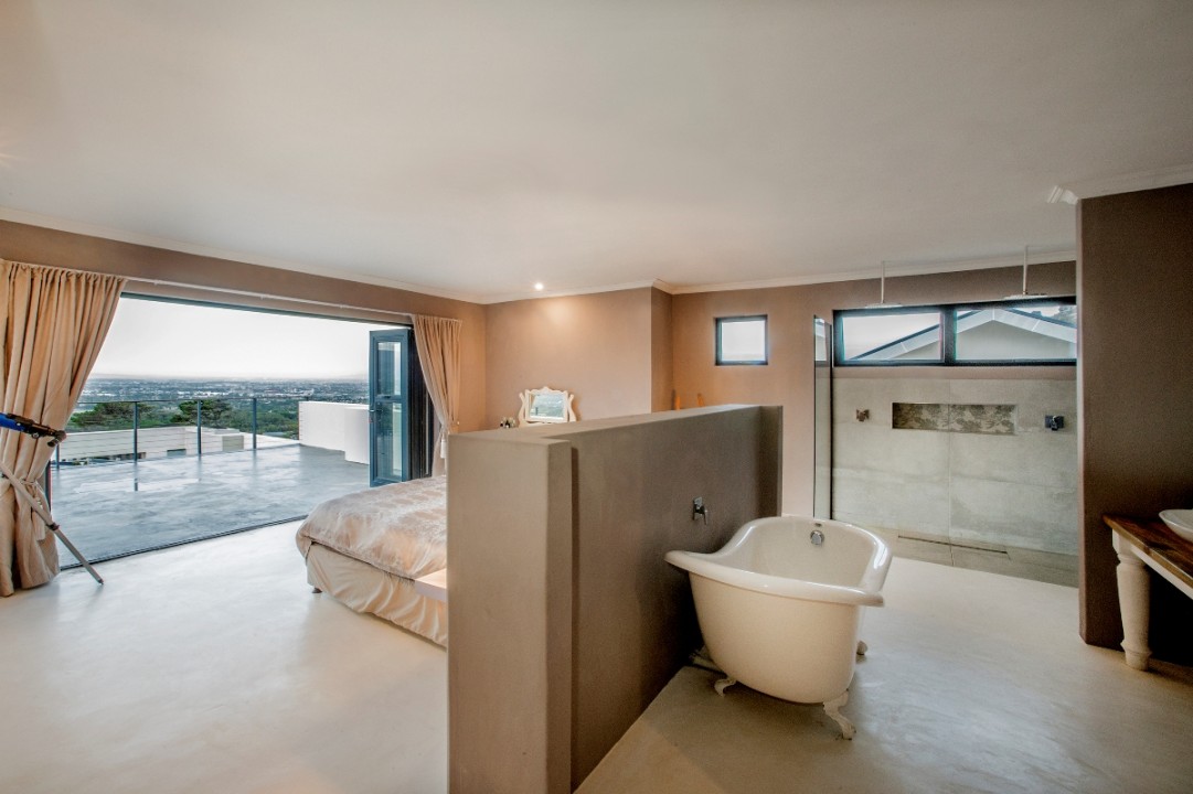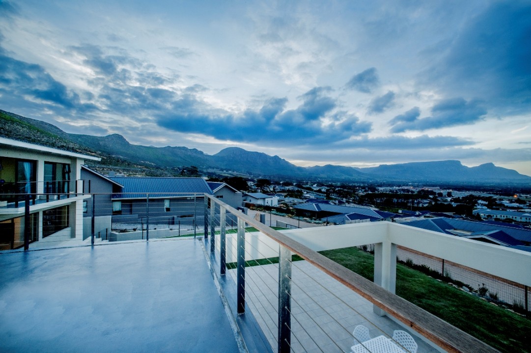 This modern double-story home overlooks the Constantia Valley and is ideally suited for relaxing family holidays. It is situated in a security estate which is nestled on the slopes of the Silvermine mountains. The house is close to some of the best wine farms, golf courses, forests and beaches Cape Town has to offer. The home consists of 4 bedrooms, 3 with ensuite bathrooms and all with their own private balcony. The kitchen, dining and lounge areas flow into one another and are perfect for cooking up a storm while entertaining guests. The pool and braai area have an incredible view and are great for outside entertaining.