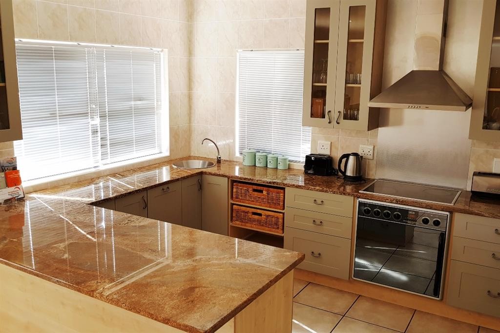 This is modern house with the living area and sheltered built-in braai on the ground floor and bedrooms on the 1st floor.