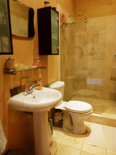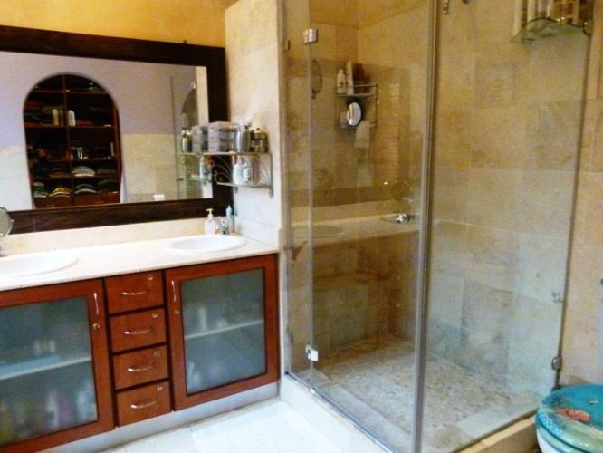 Main bedroom has a king size extra length bed with air-con and en-suite bathroom (bath and shower).
