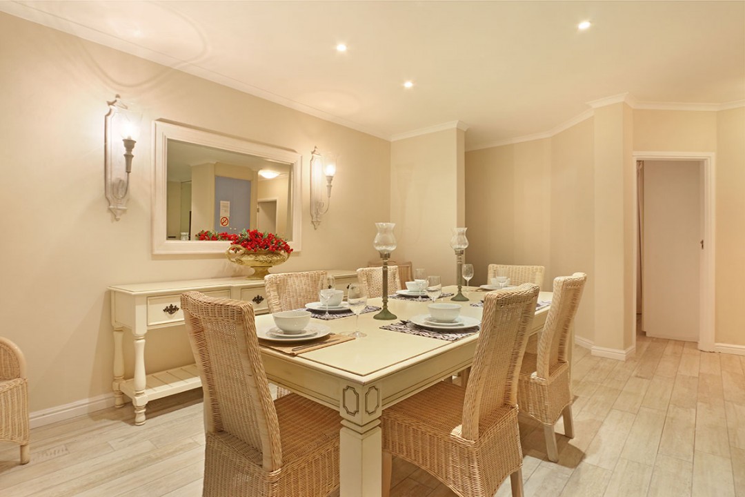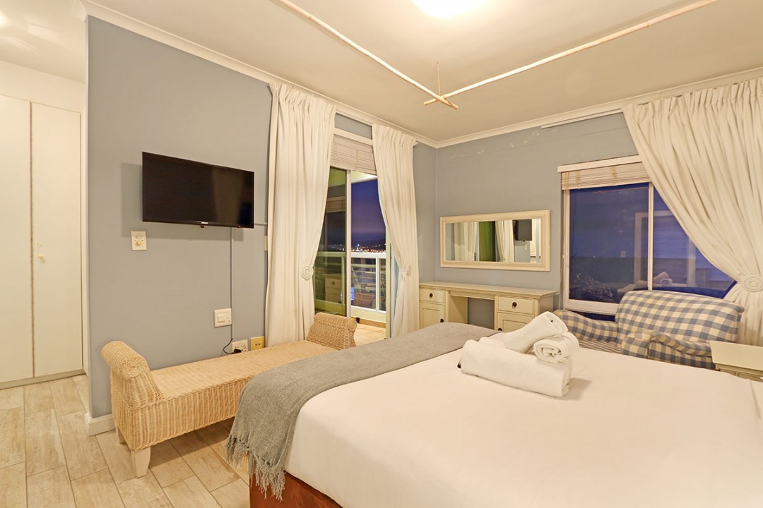 Two of the bedrooms are en-suite, while the main bedroom has the added bonus of 270 degree views of the ocean and the mountain, with Robben Island in the distance.
