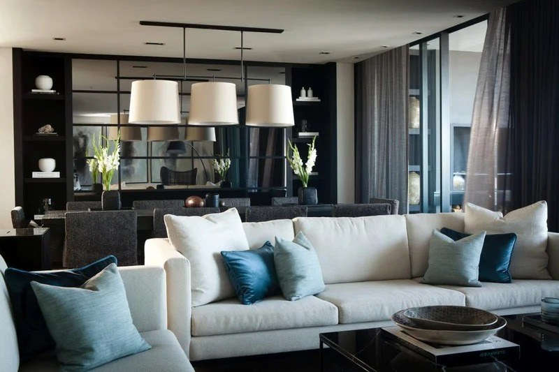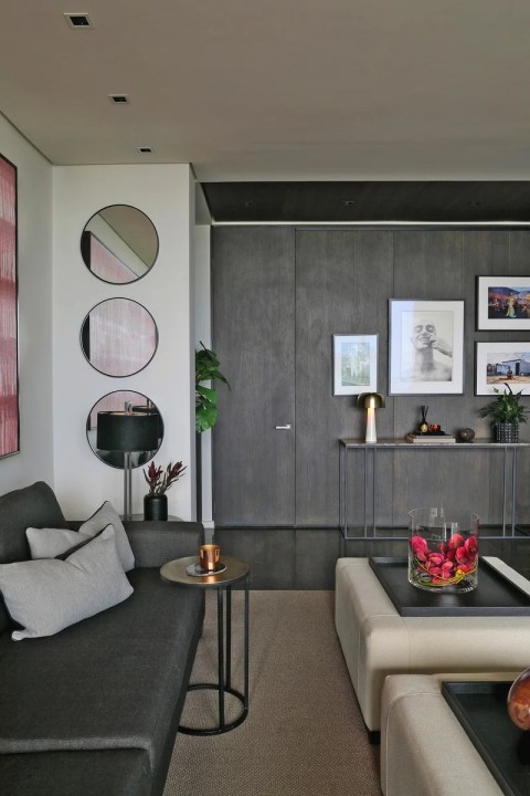 An impressive driveway leads up the hill to the front entrance that ushers you through glass doors into the hallway, featuring an attractively designed wine cellar housing the owners’ private collection. Stairs lead up to the next level where one of South Africa’s premier interior designers has created sensational open-plan living areas that are ideal for both entertaining and enjoying some laid-back relaxation.