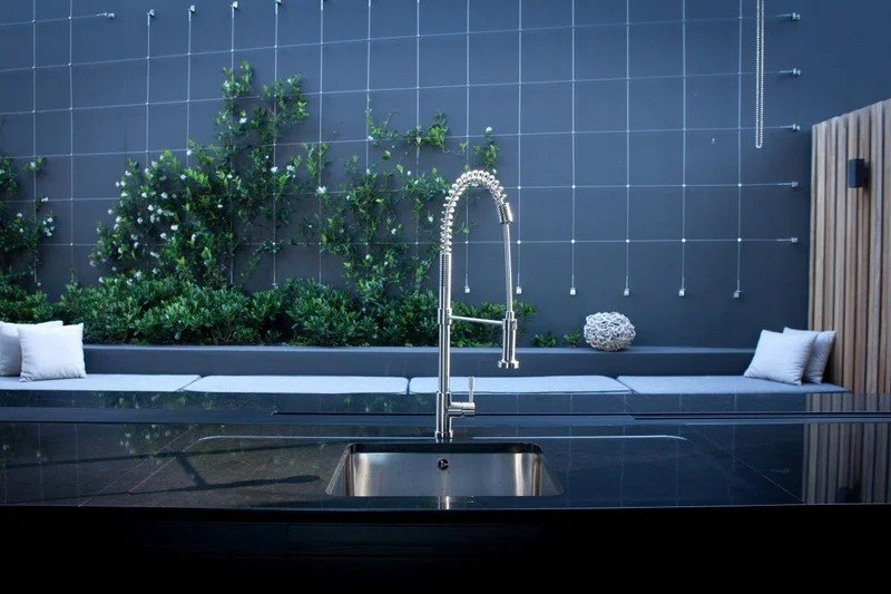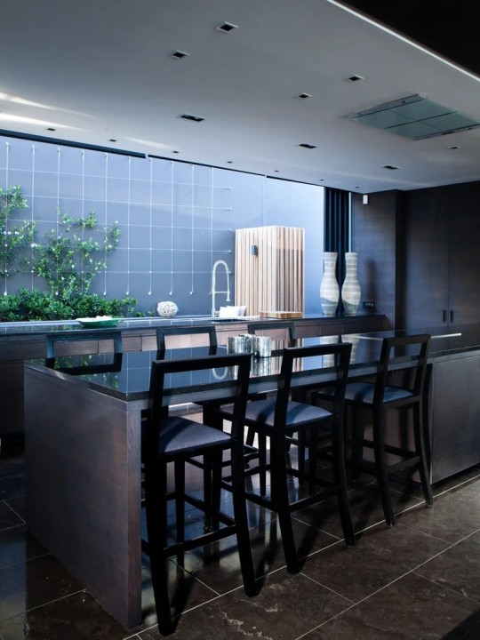 The sensational kitchen is designed for interactive meal preparation with spacious countertops and generous food prep areas, spilling out to the lounge and views of the azure ocean. Large windows slide open to create a bar service area on the sheltered rear terrace. A dining space within the kitchen seats 6, with another dining area seating 10.