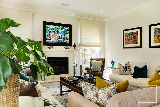 The downstairs living areas are spacious, light-filled, and designed for effortless indoor-outdoor flow. A large open-plan TV lounge and kitchen form the heart of the home, with stack-back doors opening fully onto the lawn and patio. A separate formal lounge with a gas fireplace offers a cosy retreat for cooler evenings, while the dining room seats ten guests, making it ideal for family meals and entertaining. The home features a flat-screen TV with Netflix and Showmax, as well as high-speed Wi-Fi throughout.