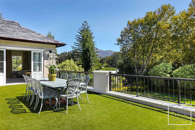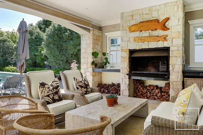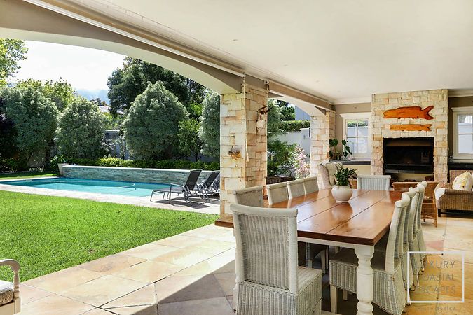 Oak House truly shines outdoors. The expansive, flat lawn provides a safe and inviting space for children to play, while the swimming pool, fitted with a pool net, is perfect for long summer days. A large undercover patio features dining for ten guests and a wood-burning fireplace, creating an ideal setting for relaxed braais and evening gatherings. Upstairs, the balcony offers yet another tranquil space to dine or unwind while taking in elevated views of the mountains and gardens.