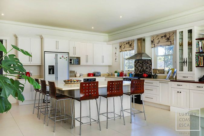 The modern, fully equipped kitchen is fitted with high-end SMEG appliances, including a gas hob, electric oven, coffee maker, microwave, and ample workspace. A separate scullery houses the washing machine, tumble dryer, and dishwasher, ensuring the main kitchen remains uncluttered and guest-friendly.