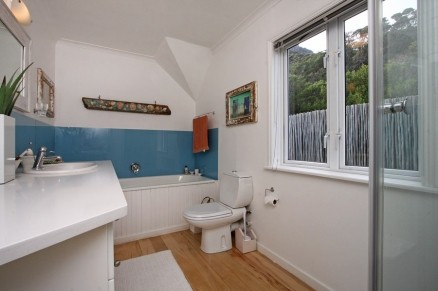 The house of about 400m2 has steps and flowing decks up to the house and down to the newly decked swimming pool. Upstairs there are 2 Bedrooms with en suite bathrooms and a study off the main bedroom with a double sleeper couch. Downstairs there is a third bedroom with separate bathroom, a guest toilet, open plan lounge, dining room and kitchen with gas stove, wine cellar, gymnasium and sauna/steam room.