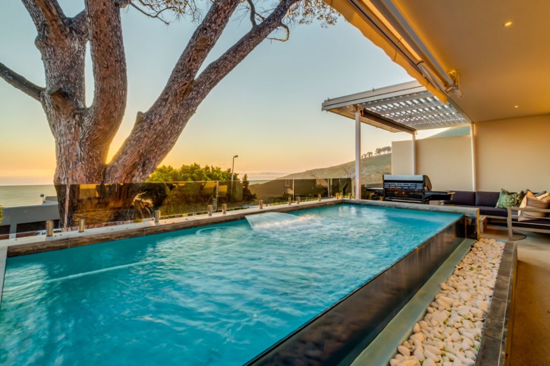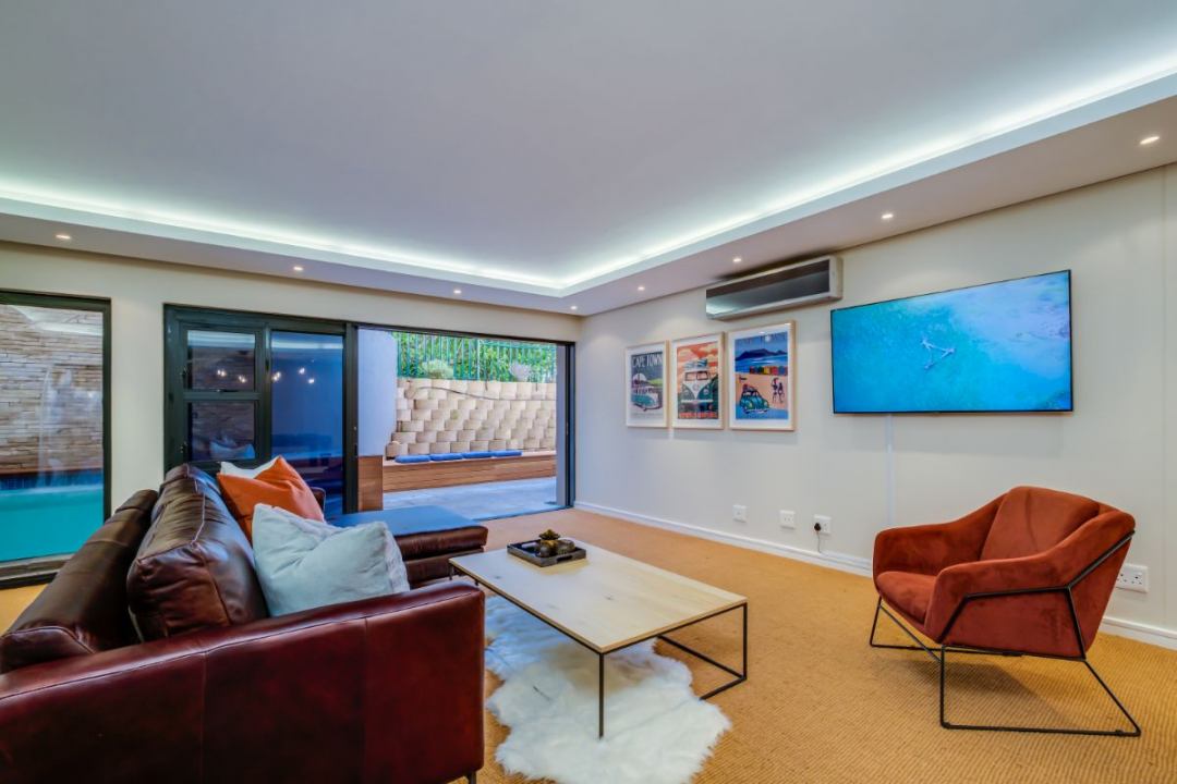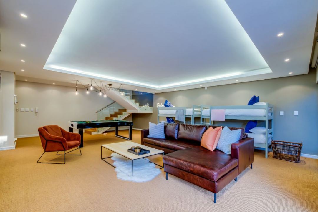 Built over 3 levels, this spacious family home is perfect for a multi-generation family holiday. There are 4 bedrooms and 3 bathrooms with additional bunk beds in the games room. The main entertainment area, with a comfortable lounge, expansive dining areas and a modern open plan kitchen, is situated on the upper level. This area has access to a private balcony with lovely views of the Atlantic Ocean. There is a private pool and gas barbeque/braai on the balcony. The middle level (entrance level) has 3 bedrooms and 2 bathrooms (one en-suite) and a guest loo. The lower level of this multi-level home has the fourth bedroom (en-suite) as well as the games room with TV, comfortable couches and pool table. There are 2 bunk beds that can accommodate an additional 4 children (under 16 years). This area has access to the downstairs patio with a plunge pool.