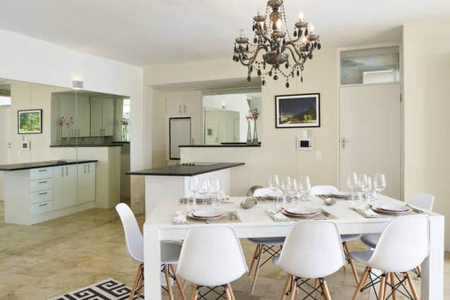 The expansive garden has magnificent views of the Atlantic Ocean, spreading from Robben Island to the rocky shore of Sea Point. The romantic entrance leads straight into an all-light decorated, open plan seating and dining for 8 people, and kitchen area, which spans with a glass front. Right in front is a swimming pool and barbecue area with Weber Grill; there are loungers on the deck for sunbathing as well as outside dining facilities.
