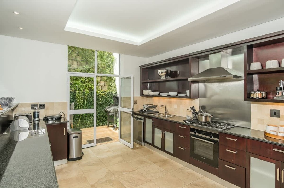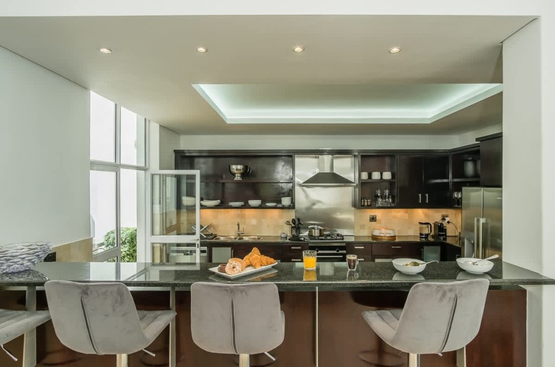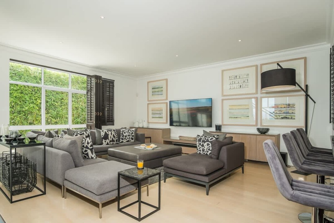 The heart of the home resides on the second floor, where an open-plan living area seamlessly combines a stylish lounge, a sophisticated dining room with an expansive table for twelve, and a fully-equipped kitchen with a three-seater breakfast bar. The lounge, adorned with plush furnishings and a large TV, extends to a second lounge area with direct access to the pool balcony.