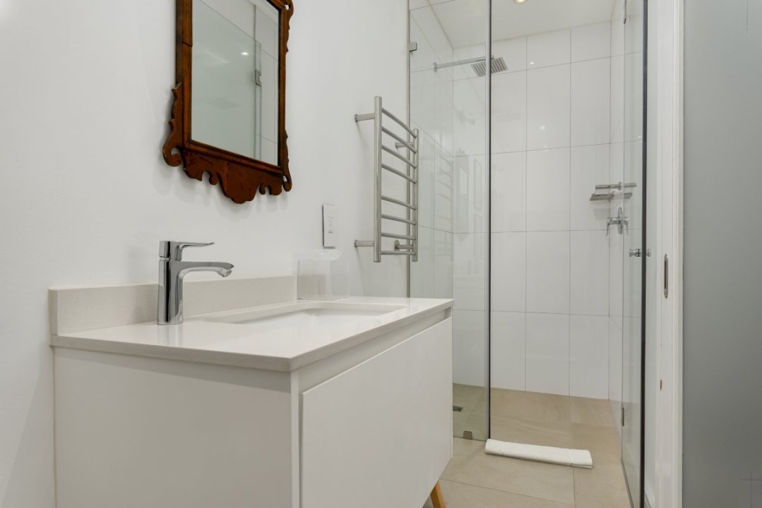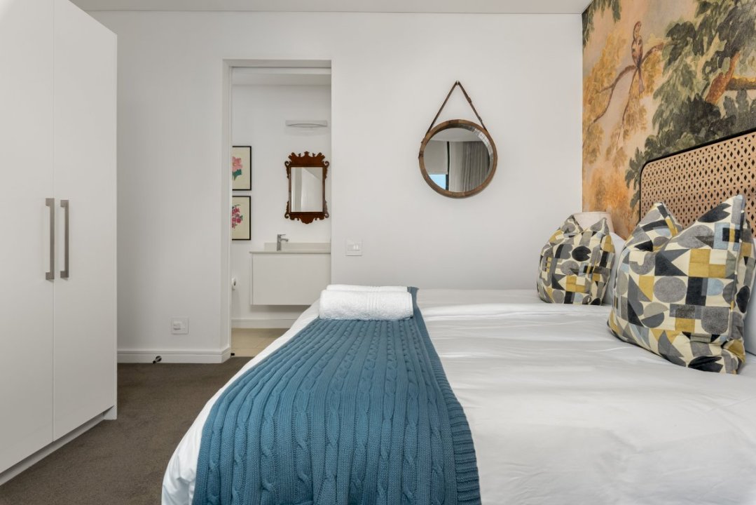 The open plan style of the space seamlessly blends a living-room-cum-dining-area leading into a large master bedroom with an ensuite bathroom and walk-in wardrobe. The second bedroom features a lush XL queen-sized bed, and ensuite bathroom, and the third bedroom has two single beds that double up as a king bed with an ensuite shower right next door.