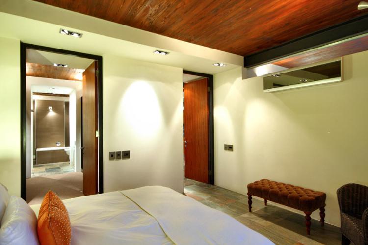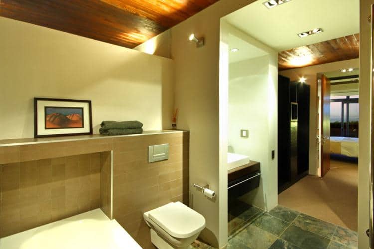 The Master bedroom, also accessing the main deck, enjoys a large king size bed, air-conditioning for warm nights and under floor heating for winter warmer moments. The en suite bathroom is accessed via the incredibly spacious master bedroom wardrobe. Twin basins, heated towel rails, modern bath and nook like shower with large shower rose create a sense of streamlined luxury.