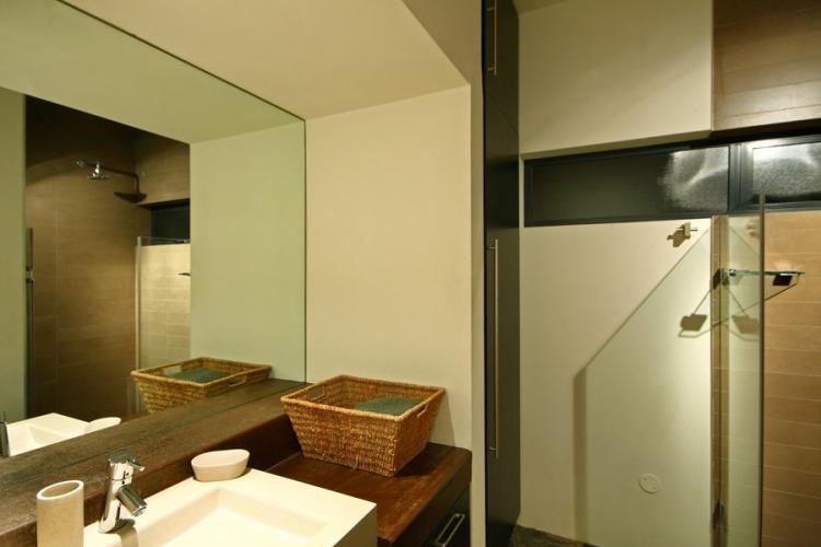 The second bedroom is positioned behind the kitchen in a large alcove type space, which leads into the second bathroom. The distinctive style and use of earth tones of this apartment resonate in calming shades of pale green against a sisal rug and dark grained wooden cupboards. The second bathroom is fitted with a single basin, well concealed washer and drying machines and a comfortably large glass-door shower.