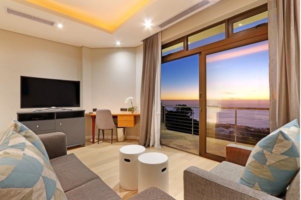King bed / full bathroom / air conditioning / small lounge area with smart TV / sea views from lounge area / balcony