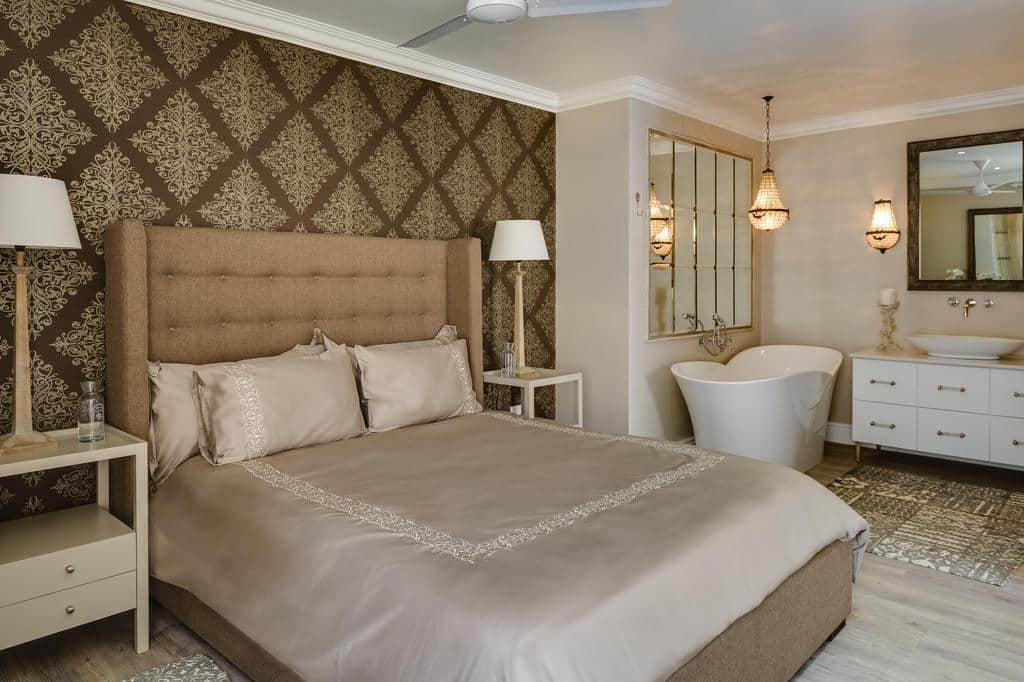 Spacious bedroom with a superior quality queen size bed and bedlinen. The open plan bathroom another unique feature of this stylish space.