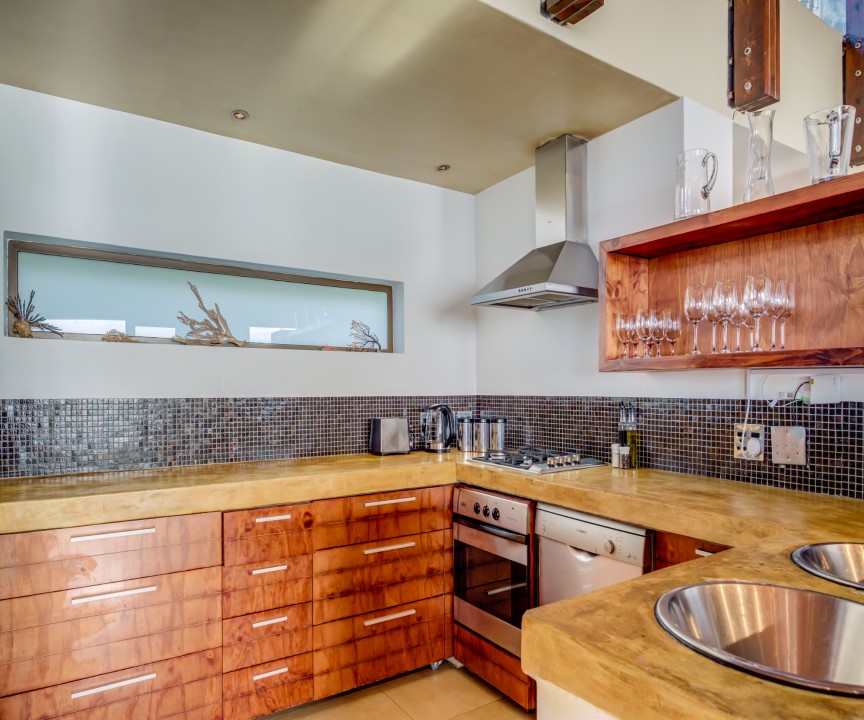 Large sliding doors connect these spaces with an outdoor terrace, which runs the length of the house and offers spectacular ocean views. A fully equipped kitchen offers modern amenities for easy holiday living, including a gas stove, built-in oven, and double fridge/freezer, with a washing machine and tumble dryer tucked away in a concealed cupboard.