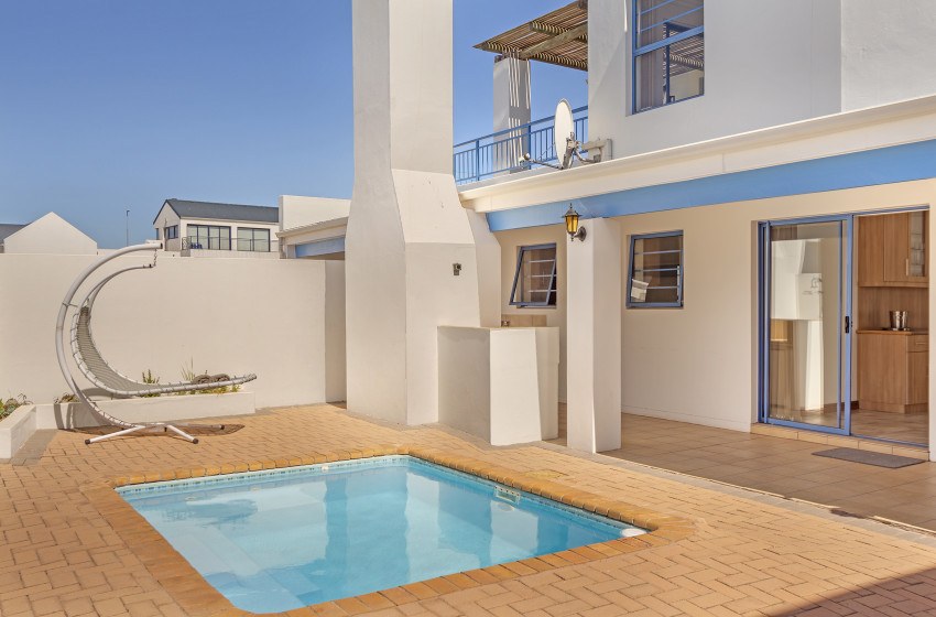 The house has the space and amenities to suit all your needs while enjoying a well-deserved vacation in one of Cape Town’s most beautiful areas. An open plan living area leads to an enclosed patio with built-in braai/ BBQ and opens up to a perfectly blue splash pool to enjoy in the hot summer months. The kitchen is well equipped for a self-catering stay, and there is a guest toilet on the ground floor. There is streaming enabled smart TVs downstairs as well as upstairs with Showmax for relaxing nights in.