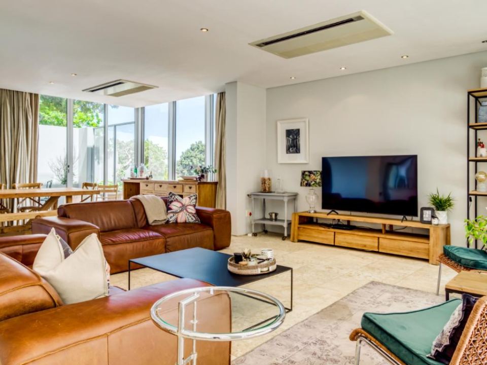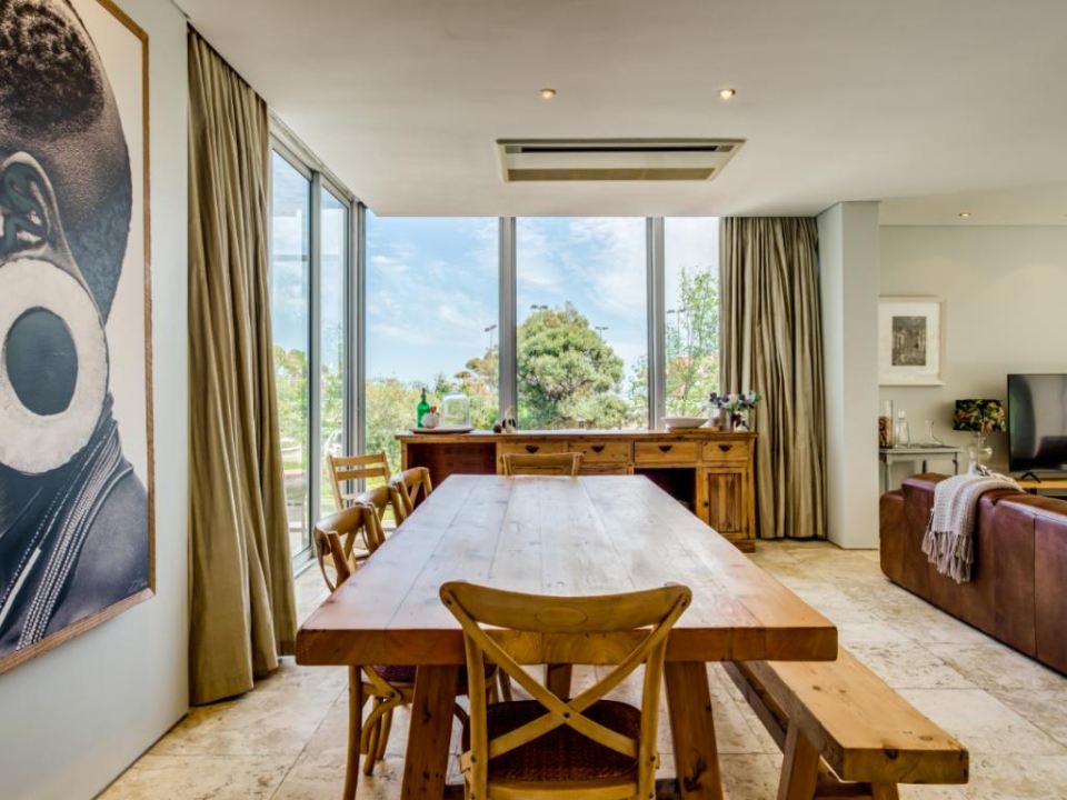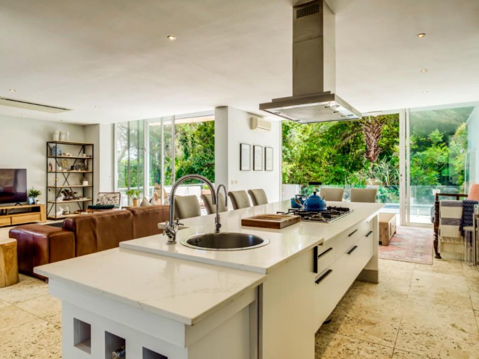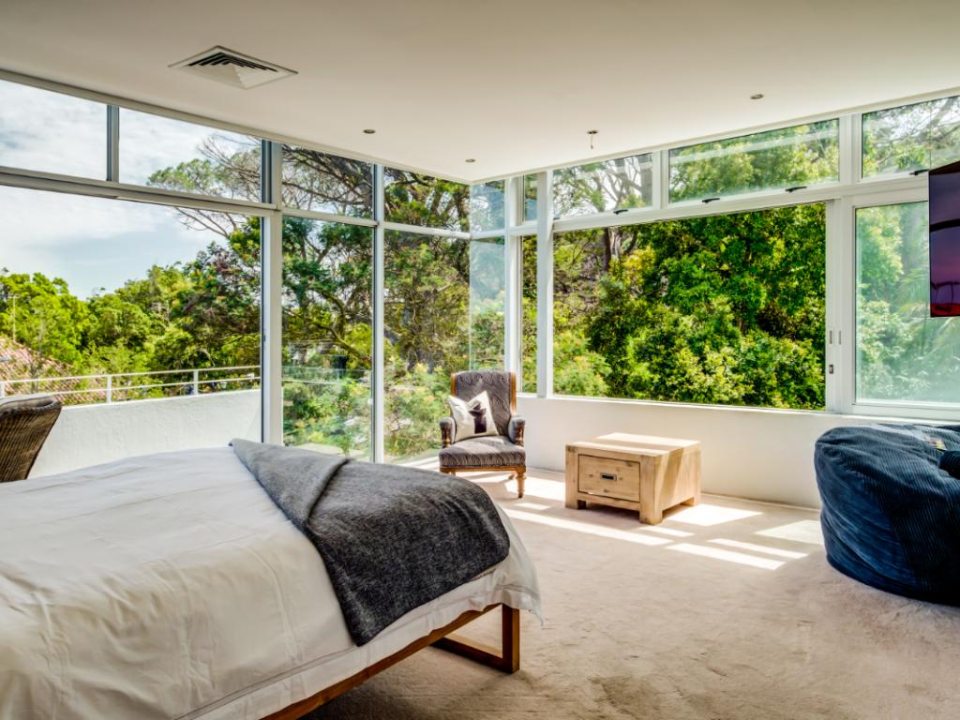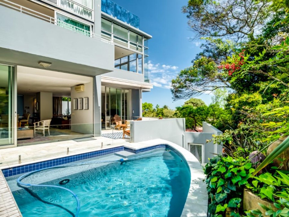 This wonderful home offers a cozy space to relax and enjoy a family holiday in a safe location. The open-plan living area features a TV lounge, dining area, reading nook, and fully equipped kitchen and scullery. The lounge has plush seating and opens out onto a sunny patio. The patio features a swimming pool with a security gate. The 3 bedrooms are upstairs. They all have air conditioning and en-suite bathrooms. The Master bedroom has a walk-in wardrobe and ocean views as well as an overlooking magic forest. The second bedroom looks out at the bushy forest and the third bedroom has ocean views. This home is a special getaway for a family holiday in Cape Town.