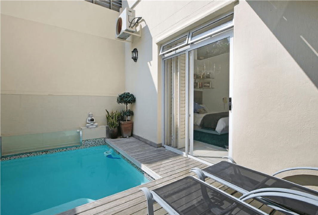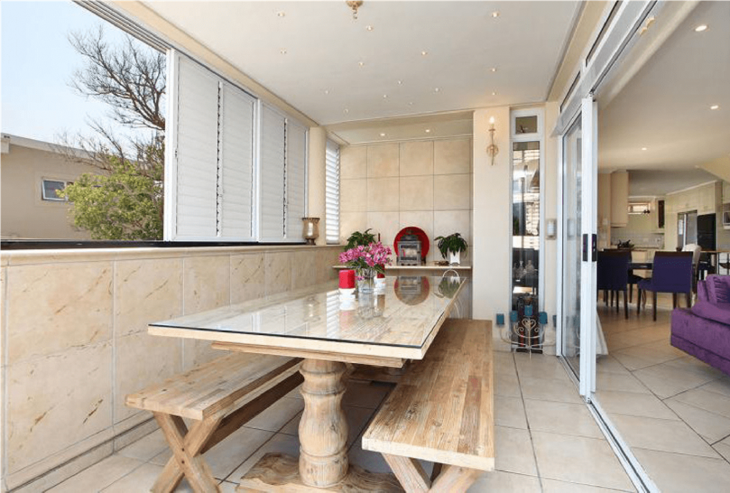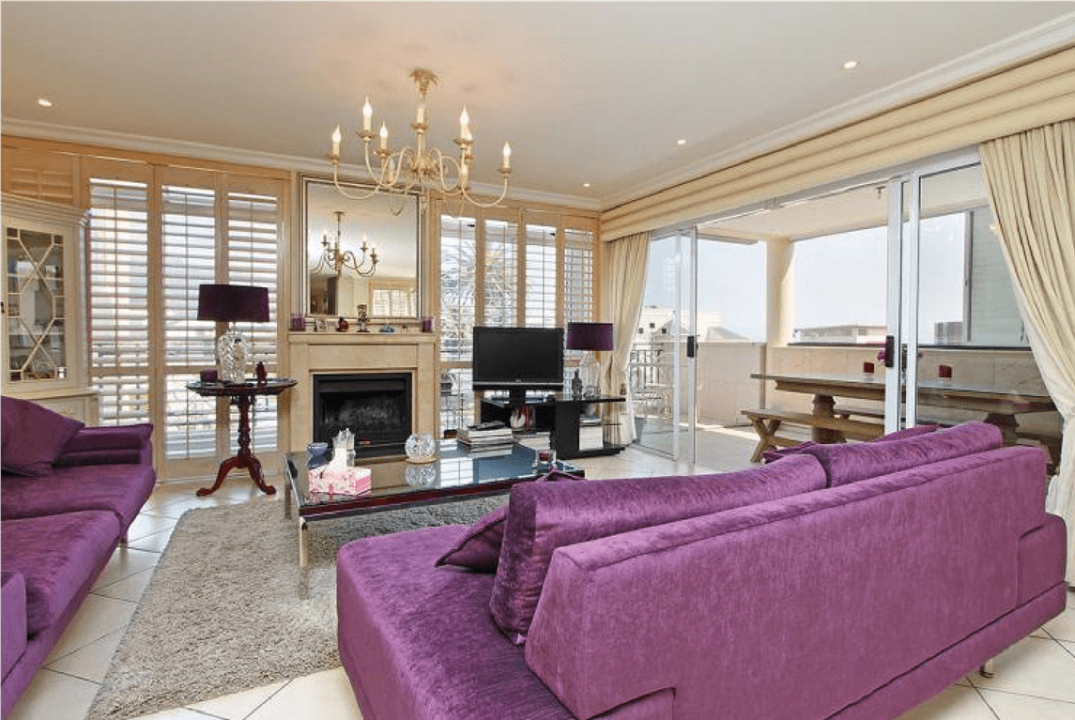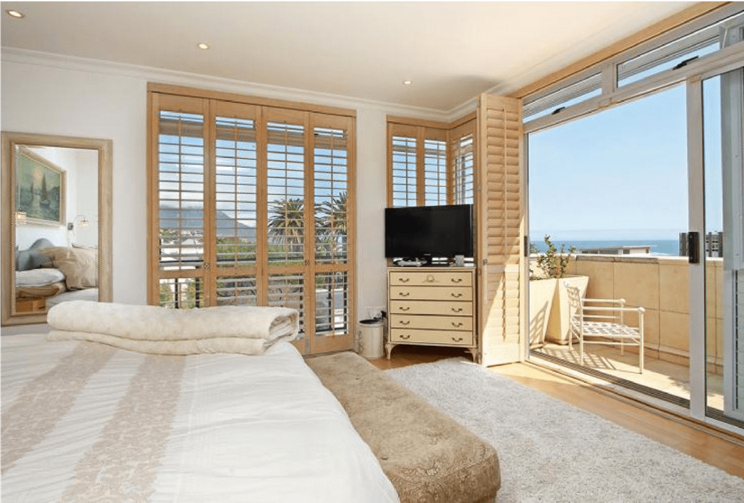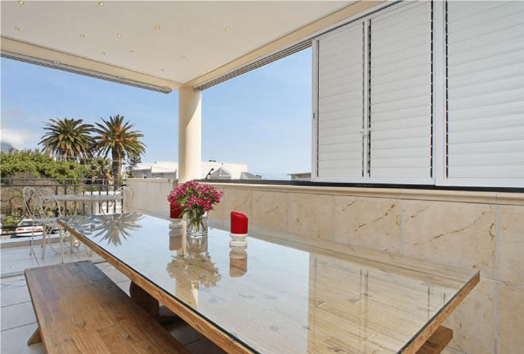 This 3-bedroom villa is situated metres from the beach on Argyle road in Camps Bay with spectacular views of the Twelve Apostle Mountains and Atlantic Ocean. The villa is situated on 3 floors. The bottom floor is dedicated to relaxing living with soft velvet lounge suite and large TV with DSTV. There is a splash pool to the left of this living area and a bedroom with en-suite bathroom which overlooks formal living area with sea and mountain views, open plan living area and dining area. The kitchen is spacious and fully equipped. The living area has an enclosed outdoor dining area with large white shutters which can be opened and closed.