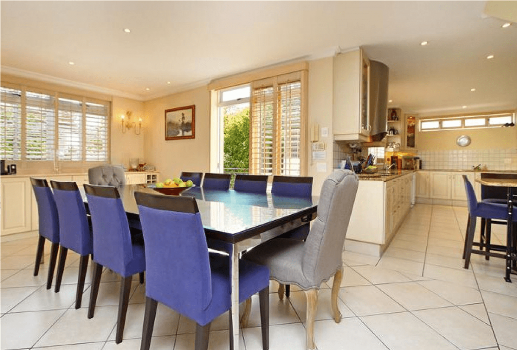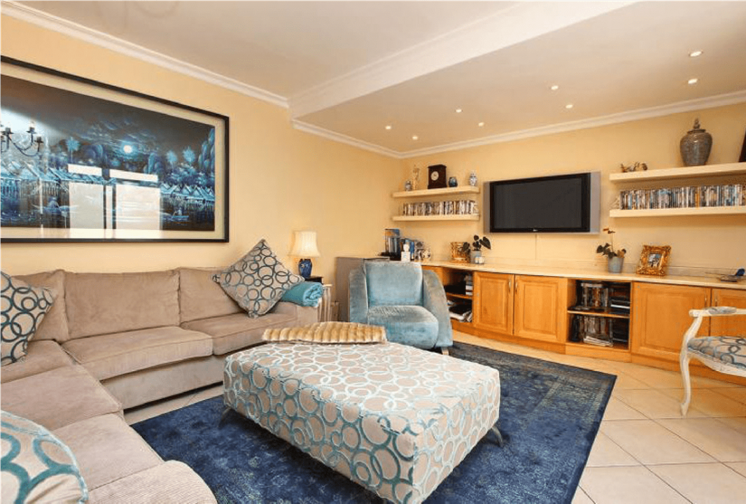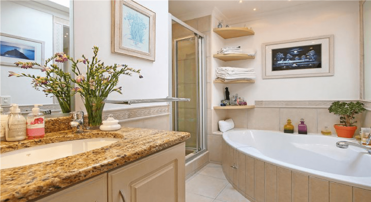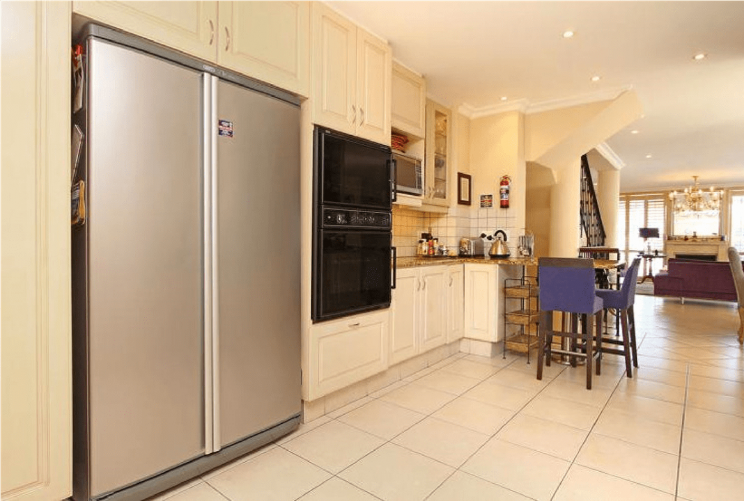 This 3-bedroom villa is situated metres from the beach on Argyle road in Camps Bay with spectacular views of the Twelve Apostle Mountains and Atlantic Ocean. The villa is situated on 3 floors. The bottom floor is dedicated to relaxing living with soft velvet lounge suite and large TV with DSTV. There is a splash pool to the left of this living area and a bedroom with en-suite bathroom which overlooks formal living area with sea and mountain views, open plan living area and dining area. The kitchen is spacious and fully equipped. The living area has an enclosed outdoor dining area with large white shutters which can be opened and closed.