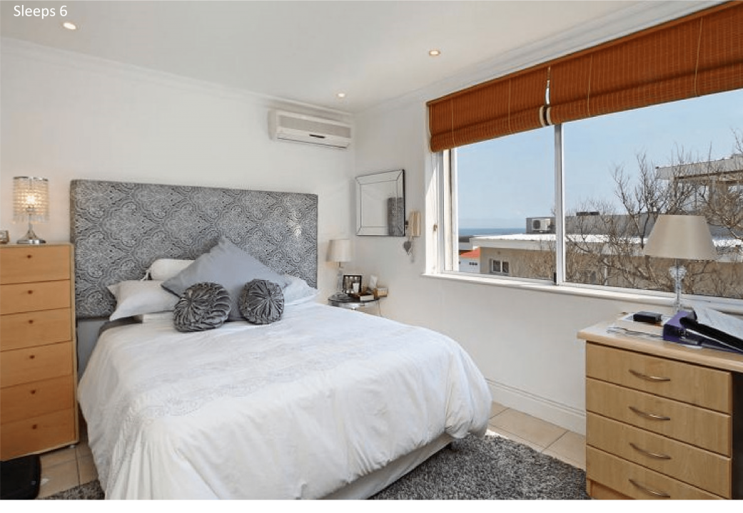 Here is another large TV with DSTV. The top floor is dedicated to the 2 further bedrooms. The main bedroom has sea views, a private balcony, large en-suite bathroom with bath and shower as well as a sky light. There is a second bedroom which has partial sea views, fitted with a double bed. The bathroom onto this room has a shower. The bedroom has a double bed. This villa sleeps 6 comfortably. There is a wireless internet connection and housekeeping included Monday to Friday excluding public holidays and weekends. There is a secure parking for 2 cars behind a security gate. The villa has an alarm with armed response. This villa is the perfect location for a holiday, situated in the centre of all the Camps Bay.
