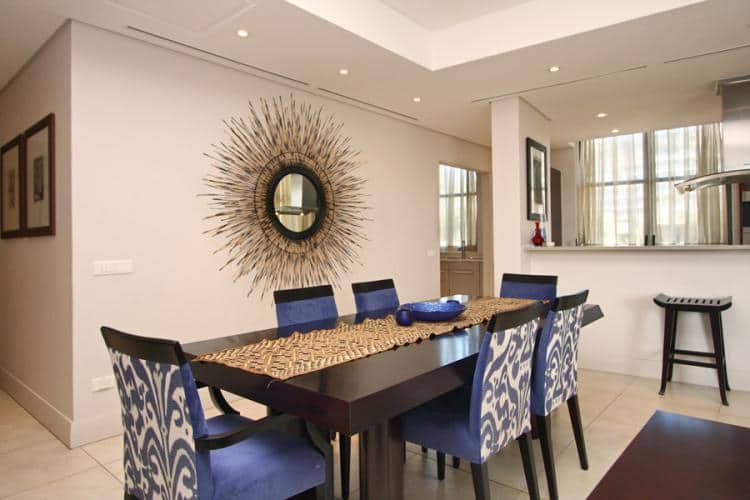 Rich textures compliment the comfortable and unique furnishings of the apartment, there is a strong and distinct African flavour running through the apartment. With a lovely kitchen set in an open plan living area this apartment provides a great space to enjoy the atmosphere of the Marina.