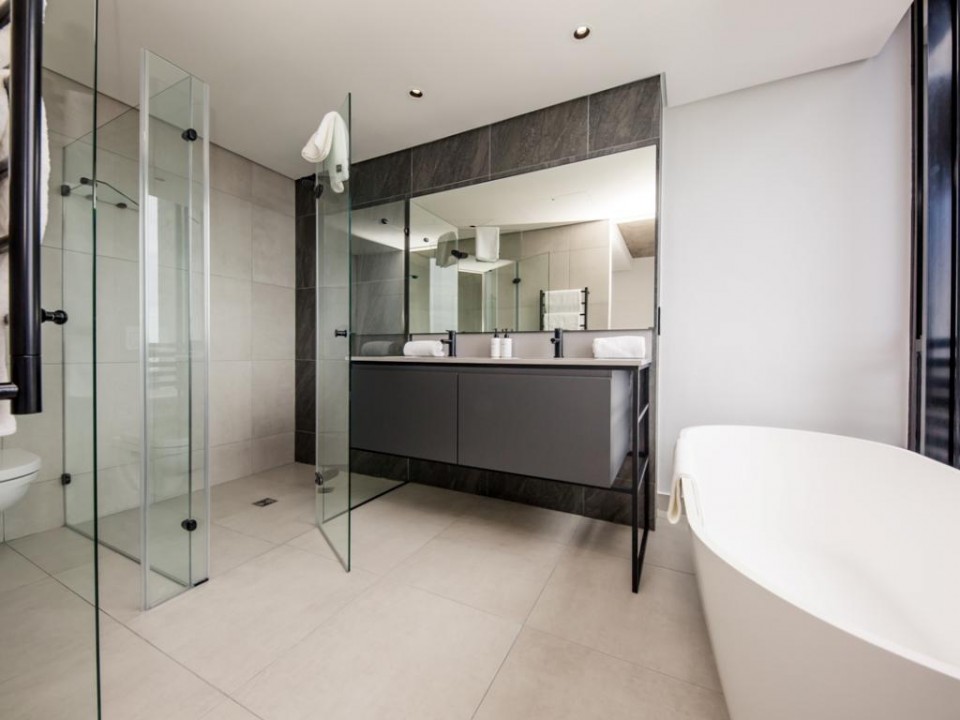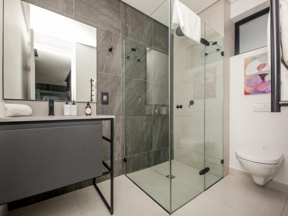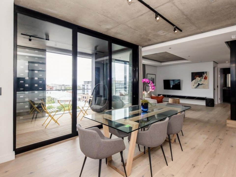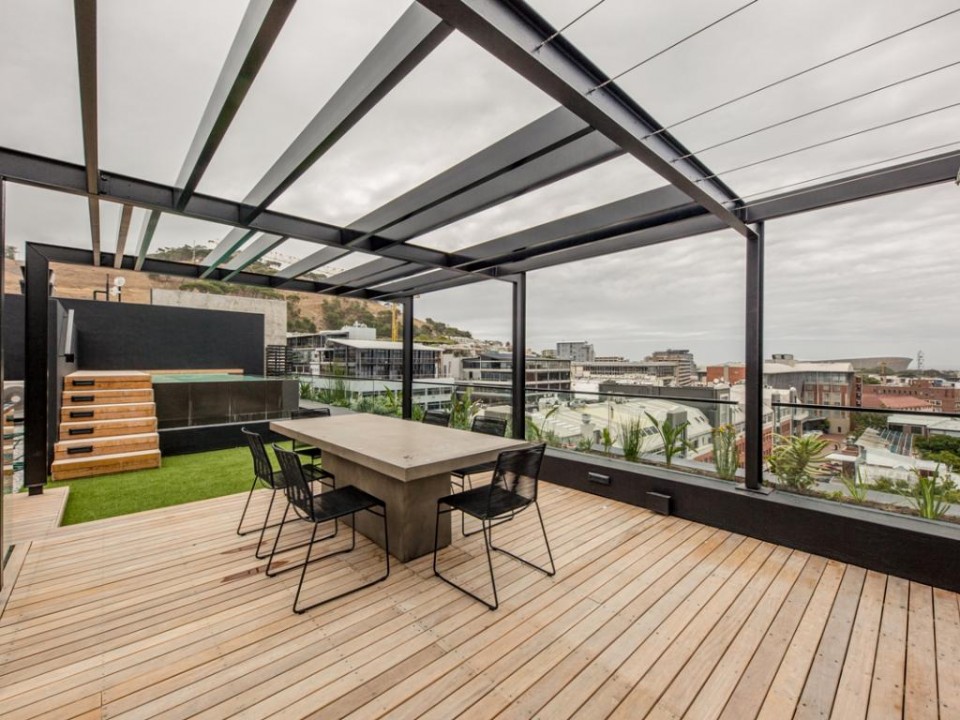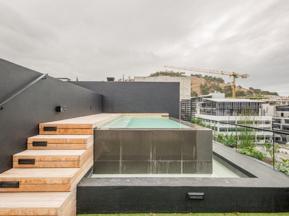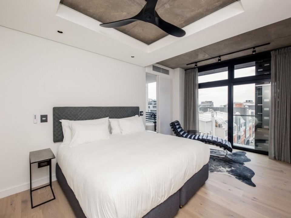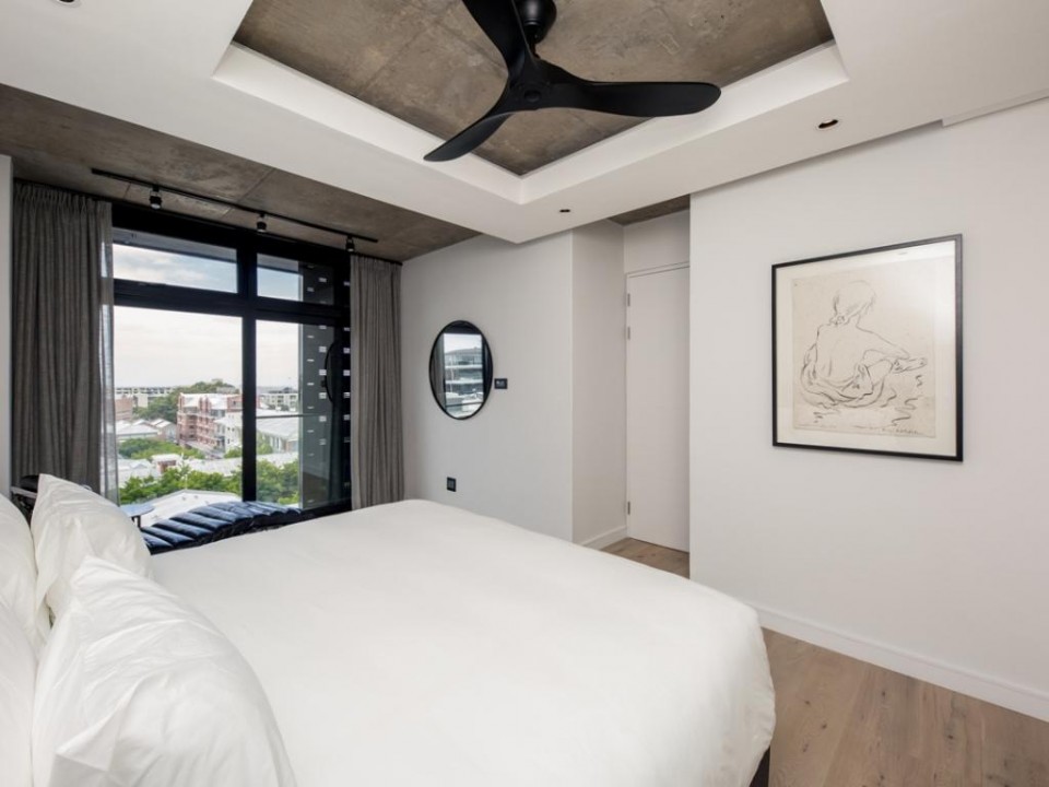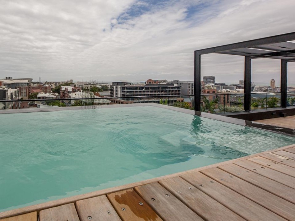 A beautiful 2 bedroom apartment located in a secure building in De Waterkant. As you enter the apartment you are welcomed by stylish and open-plan interiors. The kitchen is fully equipped with all the appliances you need for a perfect stay. The comfortable lounge has city views and a quaint balcony to enjoy. Take the outside stairs up to the rooftop deck to relax by the private swimming pool. The master bedroom has an en-suite bathroom while the second bedroom enjoys a dedicated bathroom. Both bedrooms have ceiling fans.