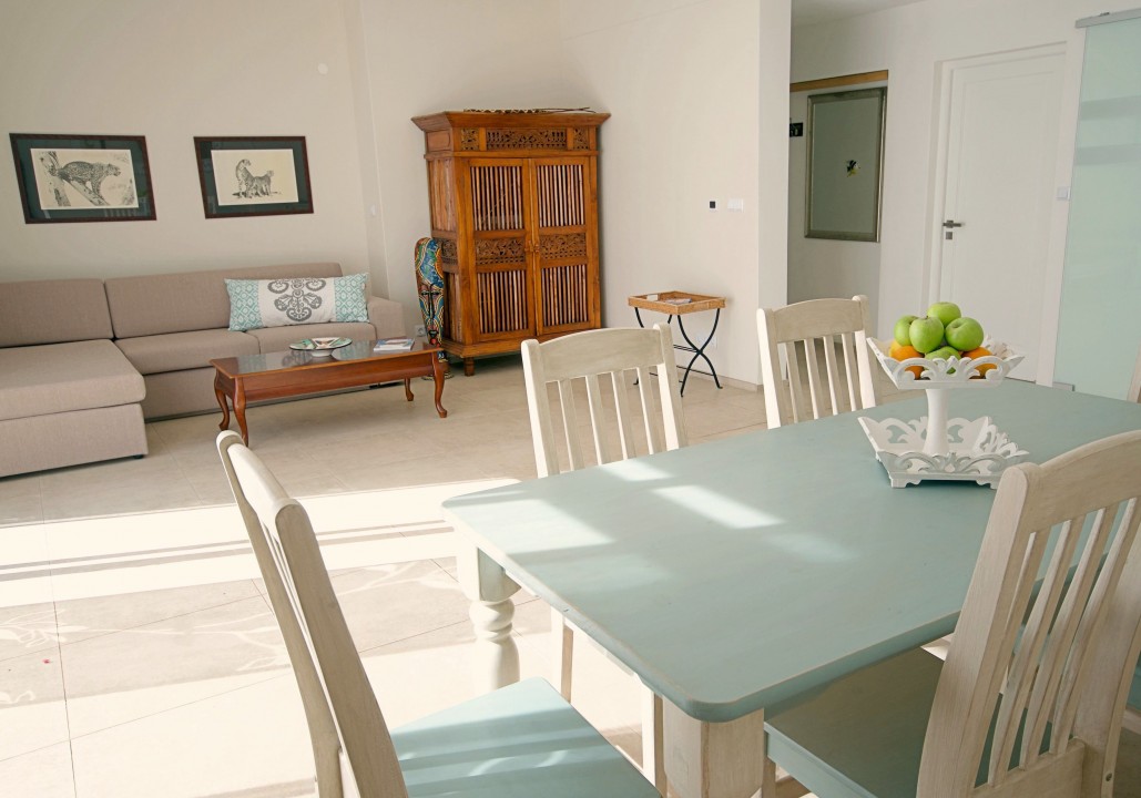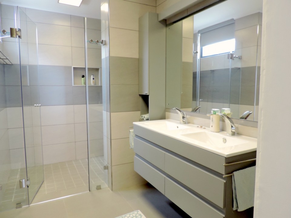 120m² single storey house with European standard furnishings and design, features two en suite bedrooms, lounge/dining area, kitchen, separate outside entertainment space with remote controlled retractable awnings. Living / Dining area and one bedroom have direct access to the salt chlorinated pool, surrounded by a wooden deck and paved surfaces.