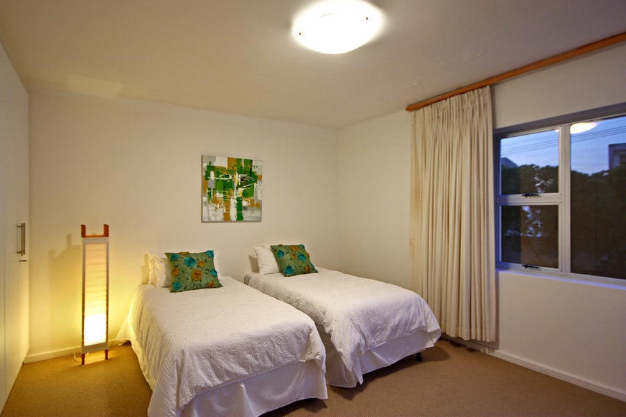 The self-contained lower floor of Phoenix Villa has a large, bright open-plan lounge and semi-equipped kitchen. Guests can open the glass sliding doors to let fresh air in from the lovely private garden with its green lawn. The two twin-bedrooms with separate bathrooms are perfect for individuals sharing a room or teenagers looking for their own space.