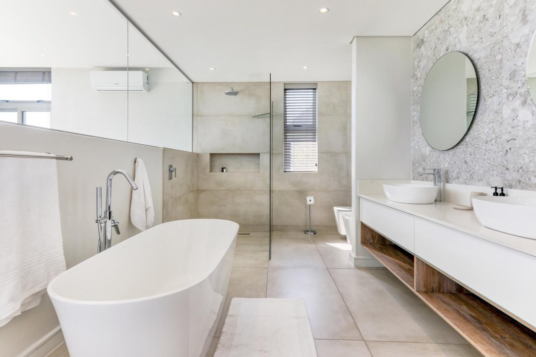 - En-suite bathroom with double basins, freestanding bath, walk-in shower, toilet and bidet