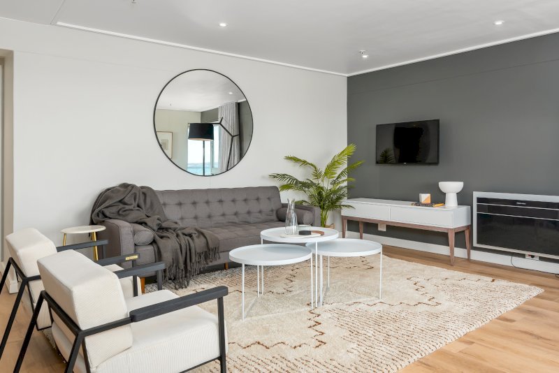 The open-plan living area is thoughtfully designed to maximise comfort and light. Relax with your favourite shows on the TV with Netflix, or open the doors to the spacious balcony and let the city and sea views become part of your living space. The flow between indoors and outdoors enhances the feeling of space and connection to Cape Town’s iconic setting.
